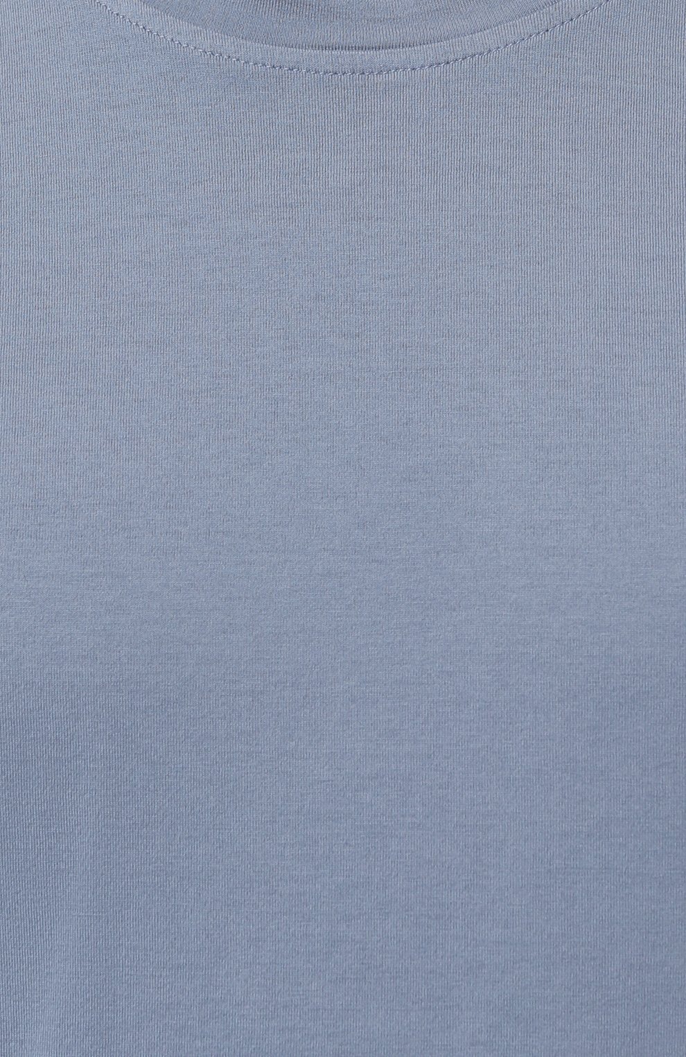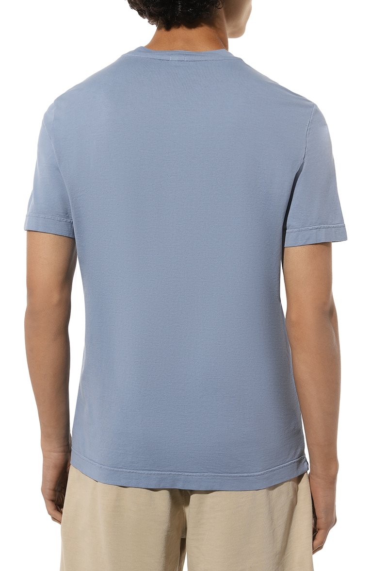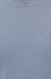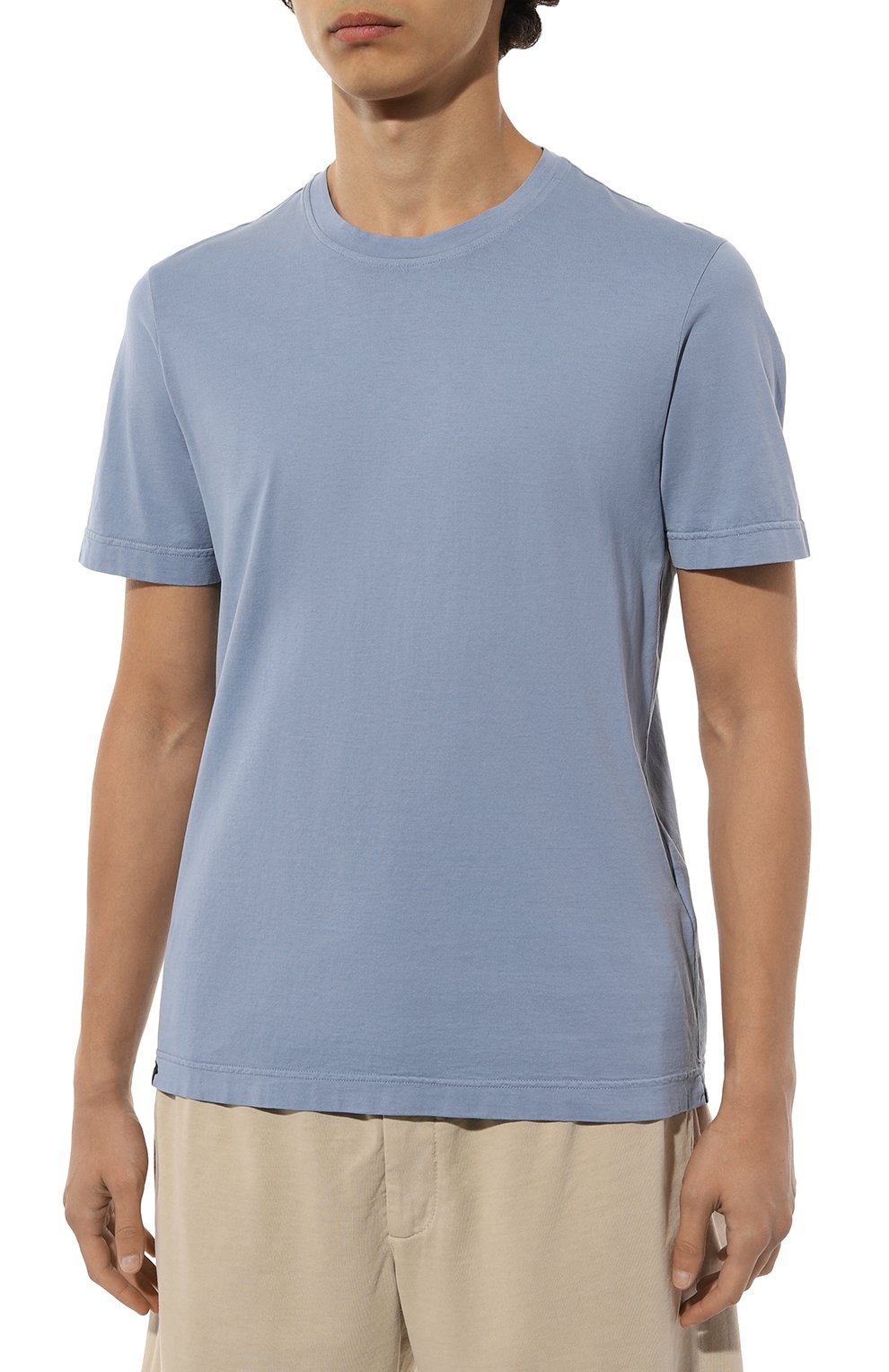 Для пошива пастельно-голубой футболки использовали мягкое дышащее джерси из ценного хлопка supima. Его длинные волокна намного тоньше, прочнее и эластичнее обычного, а в гладкости не уступают шелку, поэтому материал получился особенно приятным на ощупь и долго не теряет безупречный вид. Модель окрасили в готовом виде, чтобы придать ей слегка неравномерный насыщенный цвет.