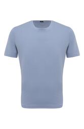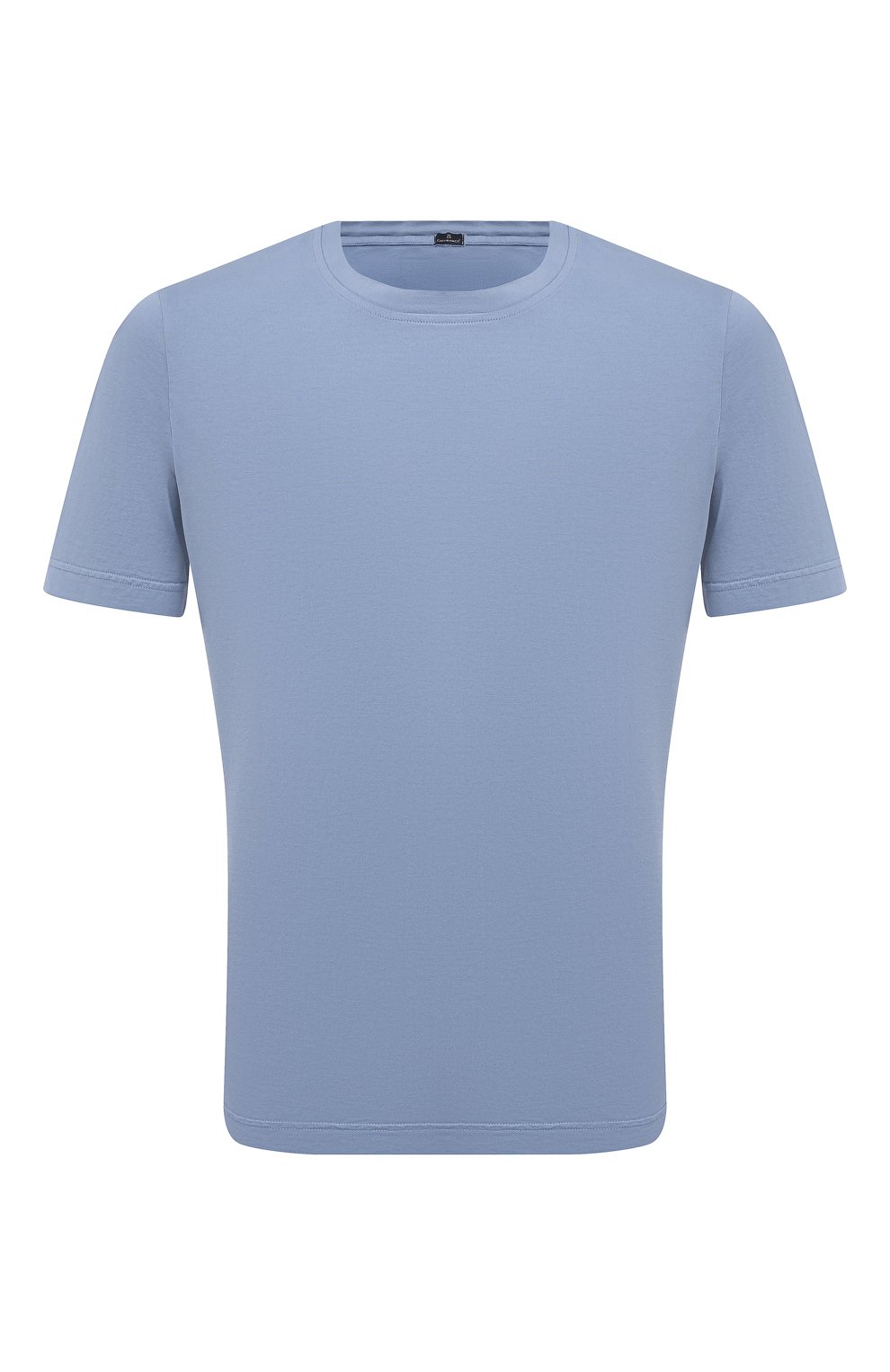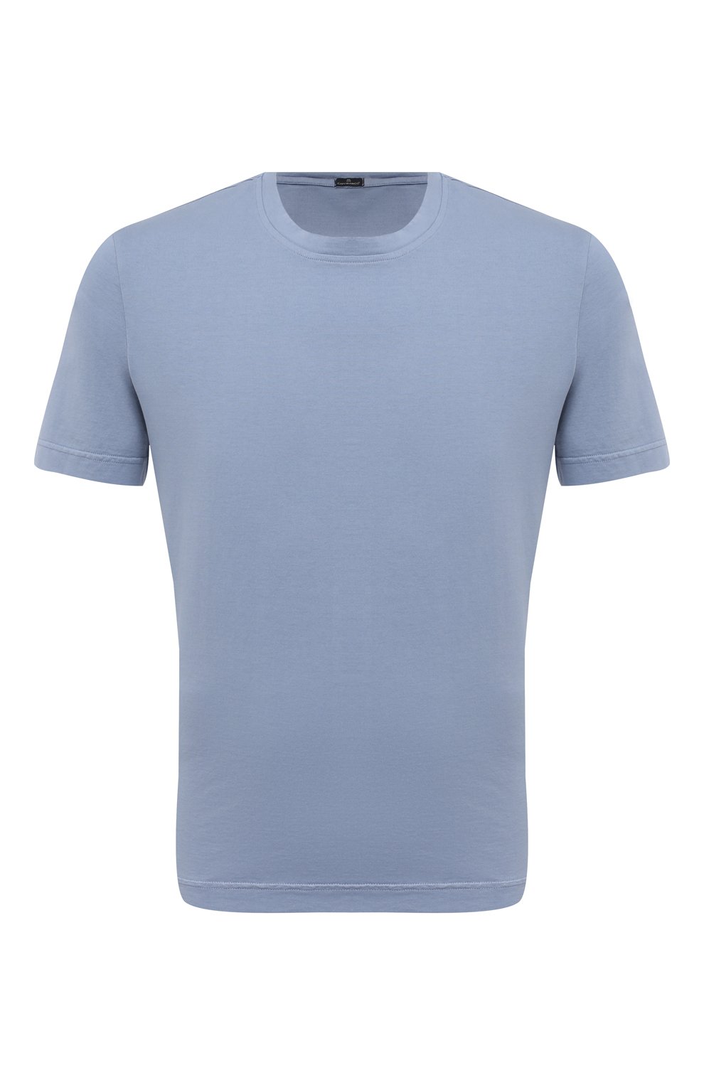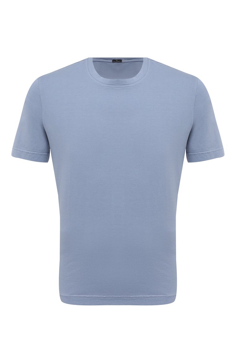 Для пошива пастельно-голубой футболки использовали мягкое дышащее джерси из ценного хлопка supima. Его длинные волокна намного тоньше, прочнее и эластичнее обычного, а в гладкости не уступают шелку, поэтому материал получился особенно приятным на ощупь и долго не теряет безупречный вид. Модель окрасили в готовом виде, чтобы придать ей слегка неравномерный насыщенный цвет.