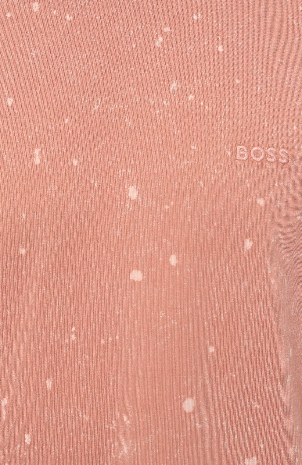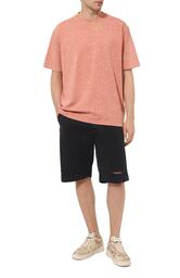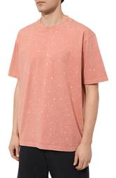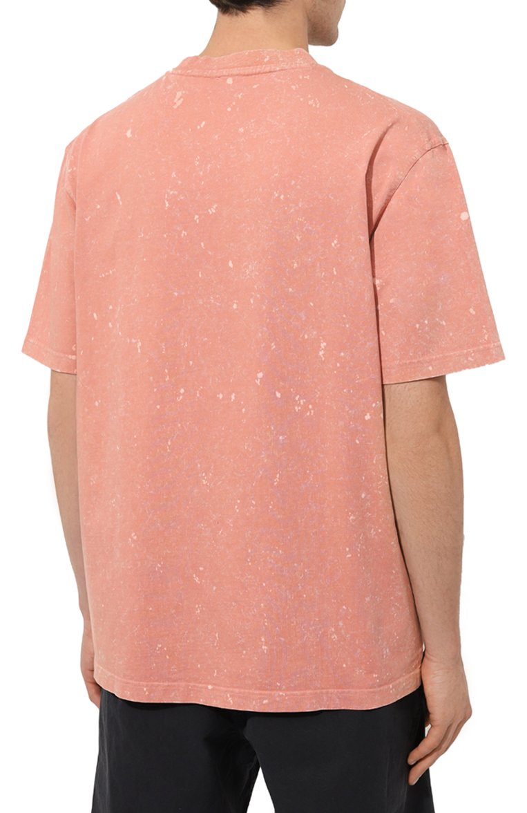 Коралловая футболка привлекает внимание мраморным эффектом, полученным окрашиванием в готовом виде. Свободную модель со слегка спущенной линией плеч сшили из мягкого джерси, органический хлопок для которого вырастили на небольших африканских фермах без применения токсичных химикатов и искусственного орошения. Принадлежность марке обозначили вышитым логотипом в тон.
