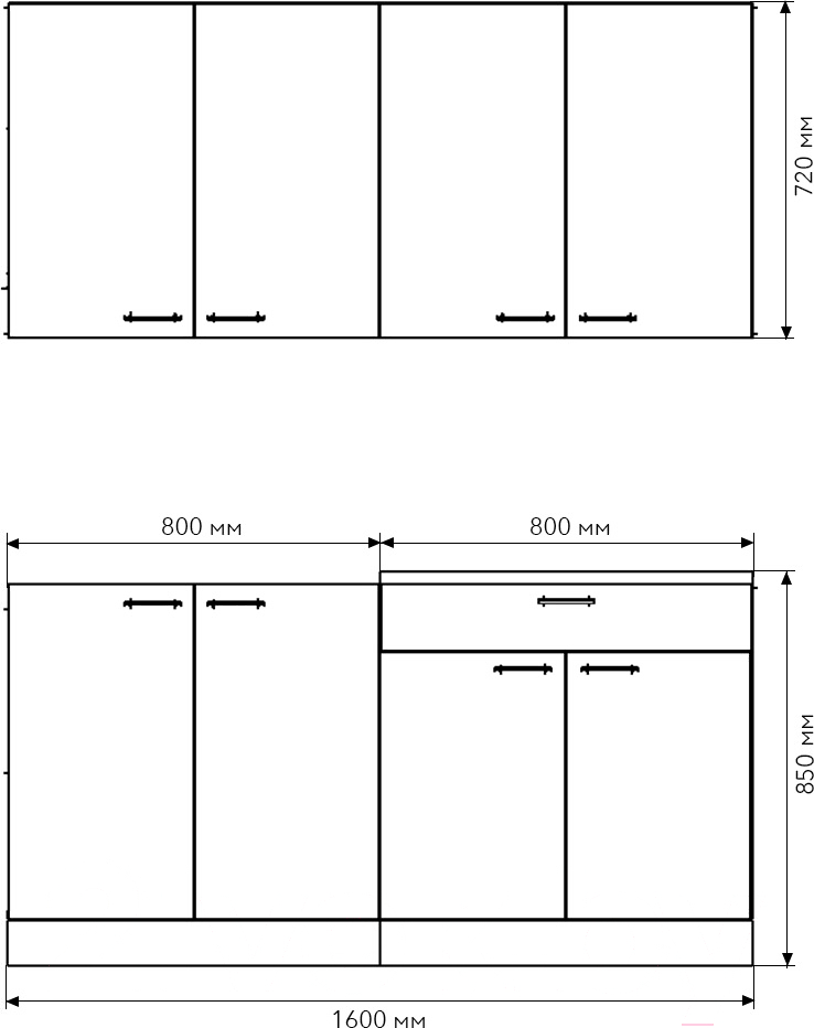 - Высота нижних шкафов 85 см (высота без столешницы: 82 см)