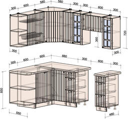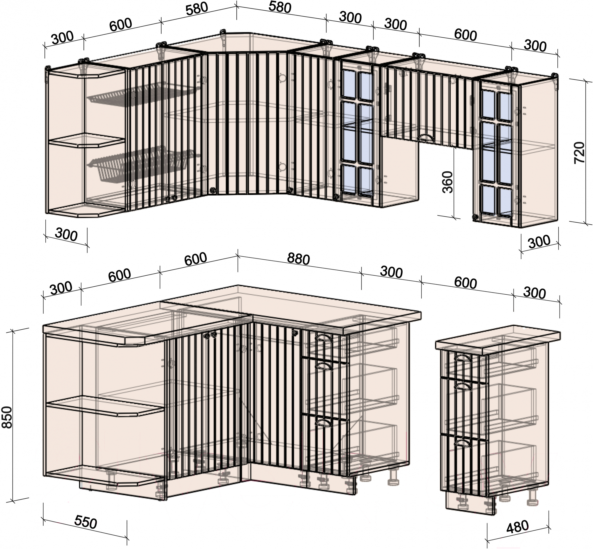 • Глубина нижних шкафов 55 см (глубина по корпусу — 48 см)