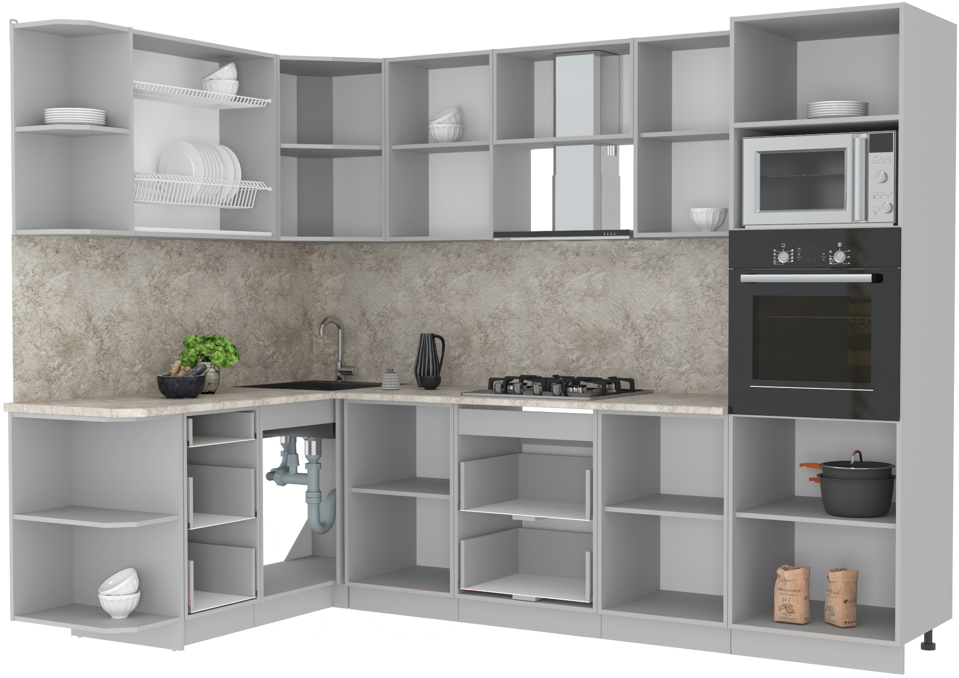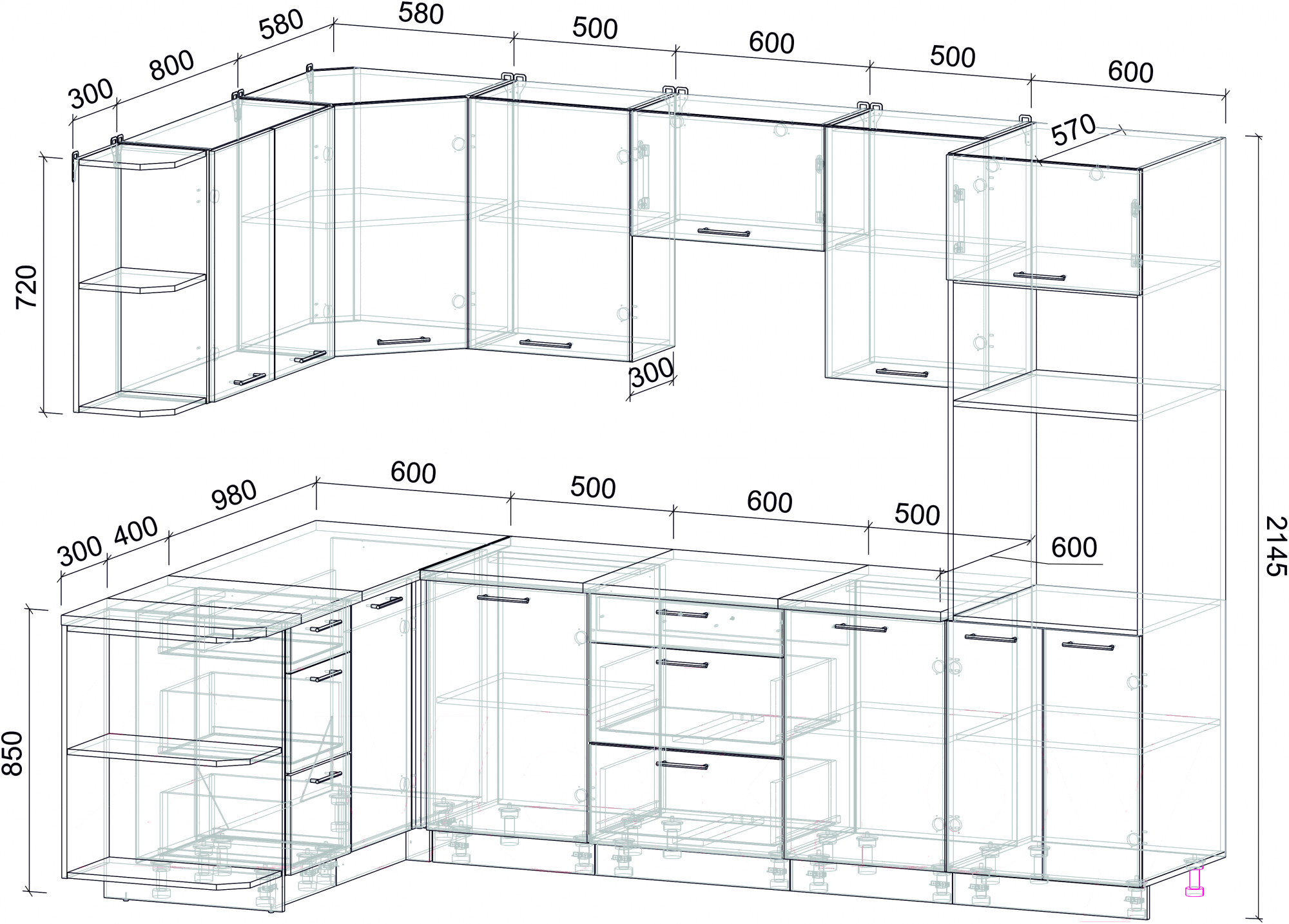 - Глубина нижних шкафов 60 см (48 см — глубина по корпусу)