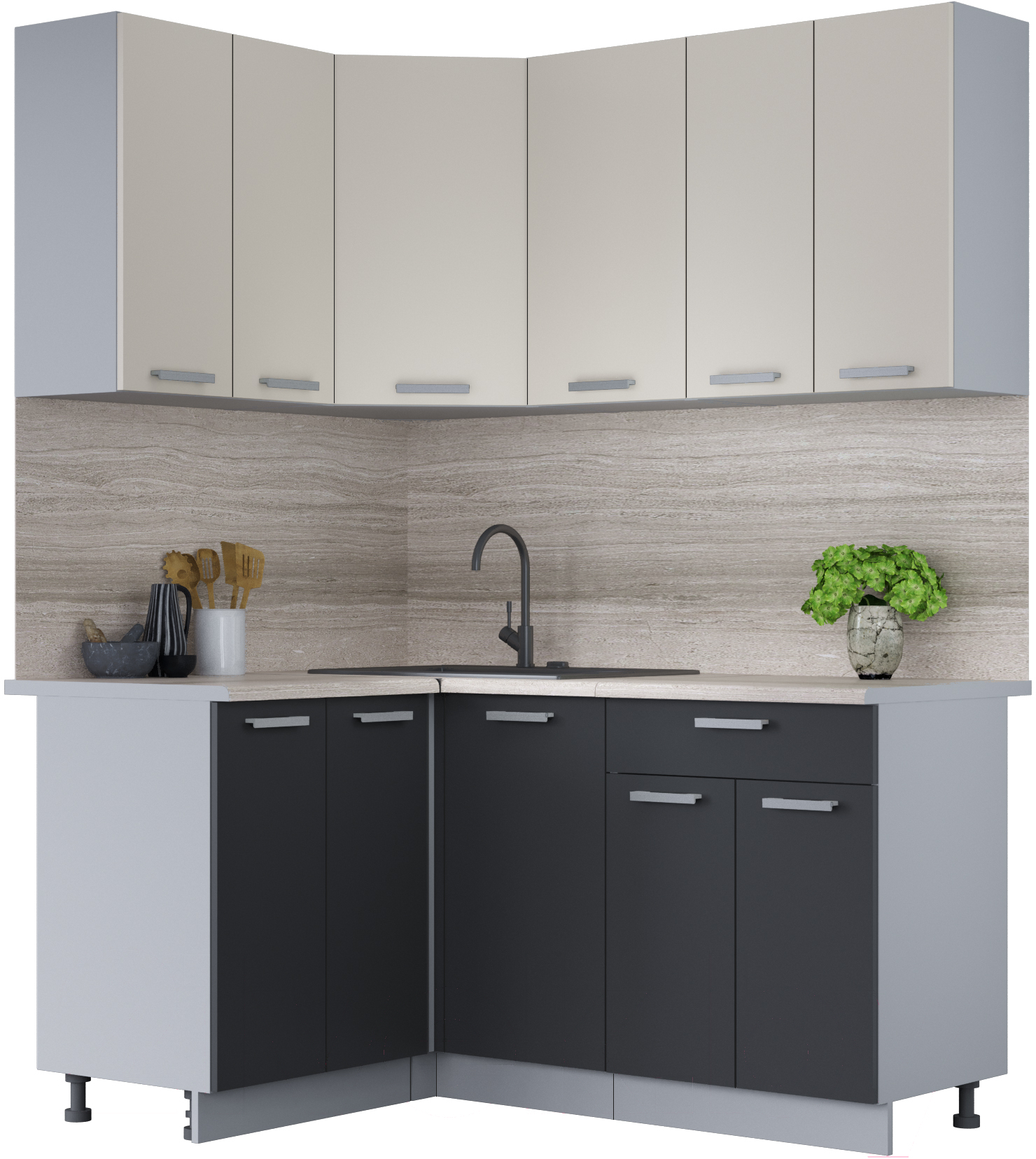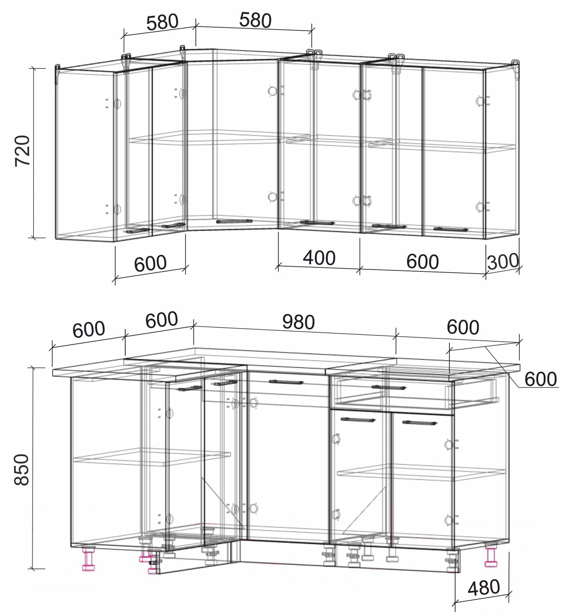 - Глубина нижних шкафов 60 см (48 см — глубина по корпусу)