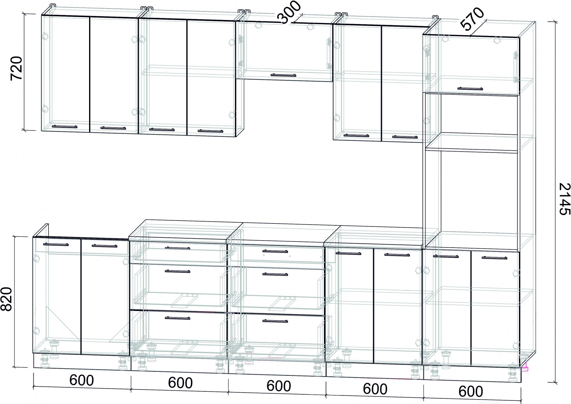 - Глубина нижних шкафов 60 см (48 см — глубина по корпусу)