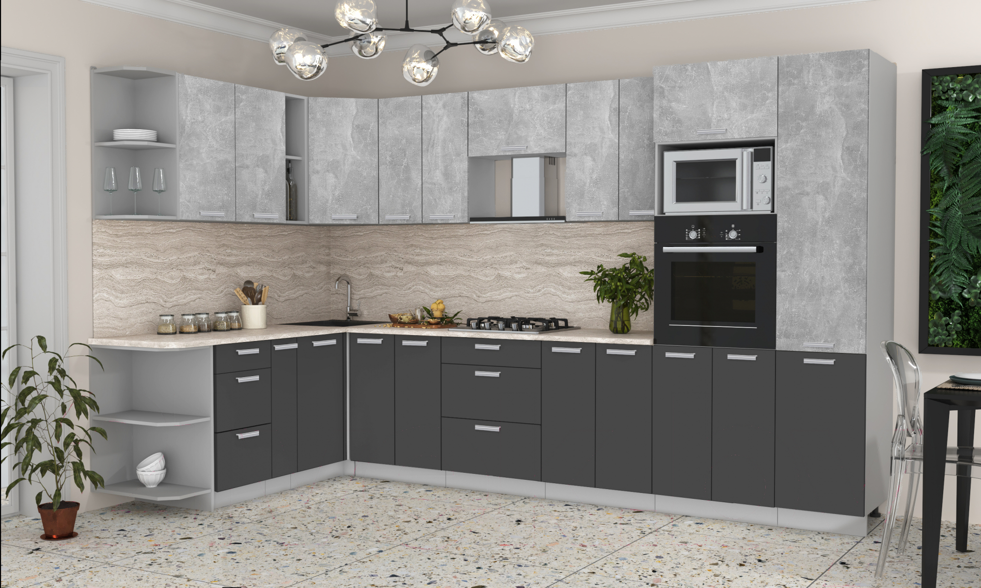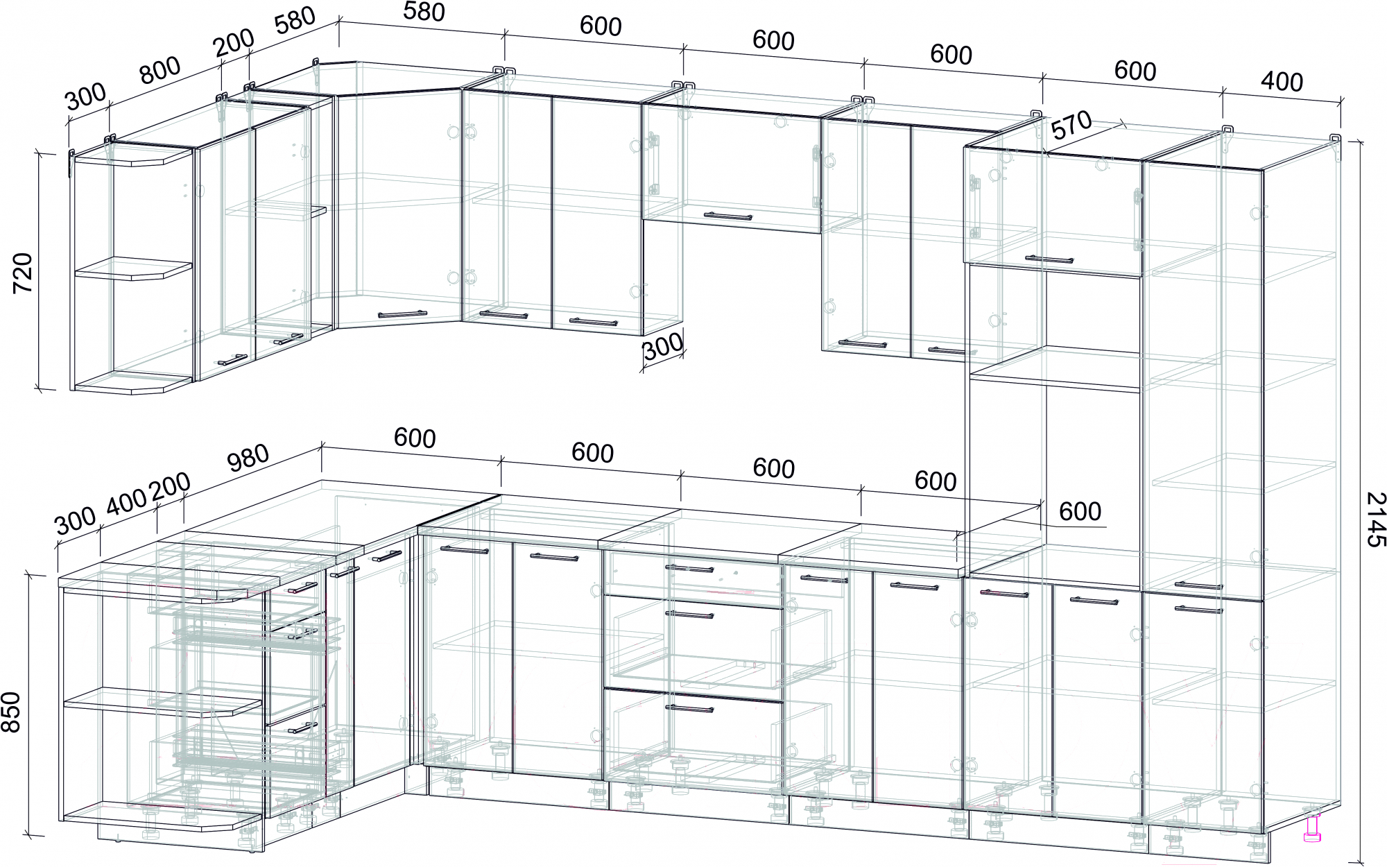 - Глубина нижних шкафов 60 см (48 см — глубина по корпусу)