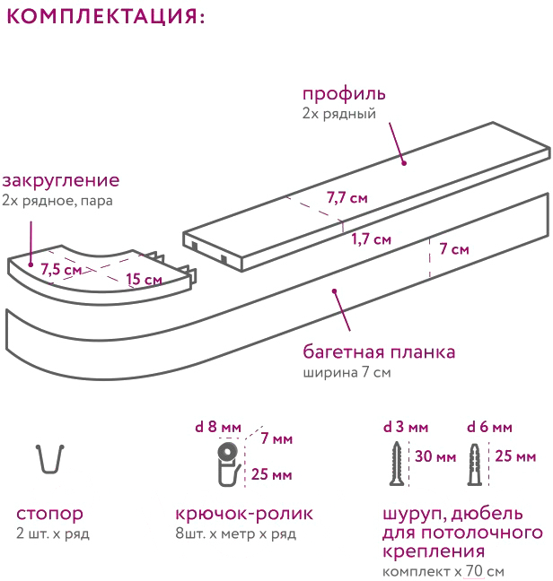 - Количество колец/крючков 8 шт. на 1 м длины карниза