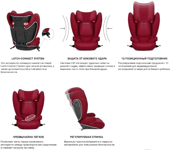 - Возможности регулировки наклон спинки, высота подголовника (12 положений), натяжение ремней