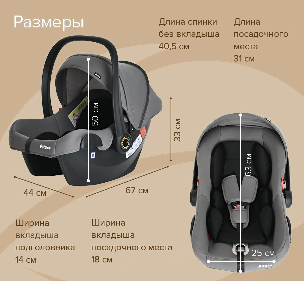 • Ширина 44 см (25 см — внутри, 14 см — вкладыша подголовника, 18 см посадочного)