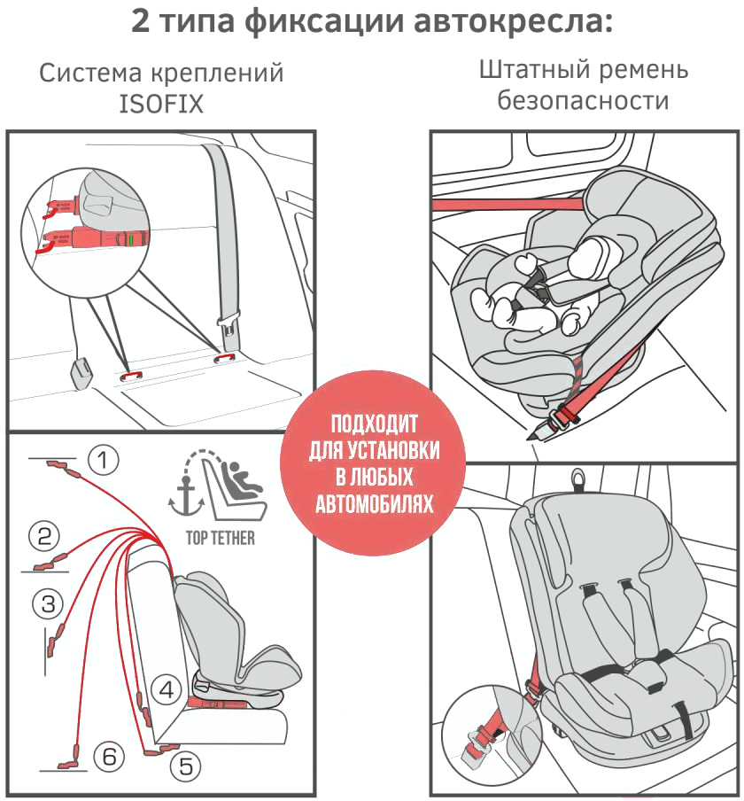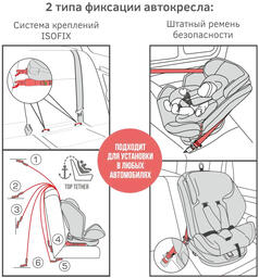 • Крепление кресла Isofix, штатный ремень автомобиля