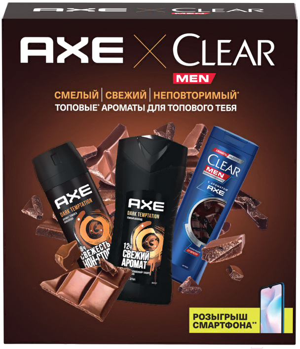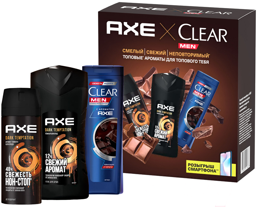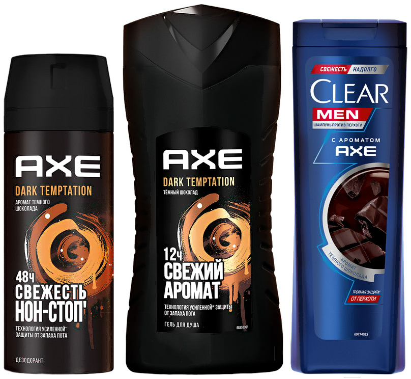 Набор косметики для тела и волос Axe Clear Dark Temptation 2023 Дезодорант+Гель для душа+Шампунь (150мл+250мл+200мл)