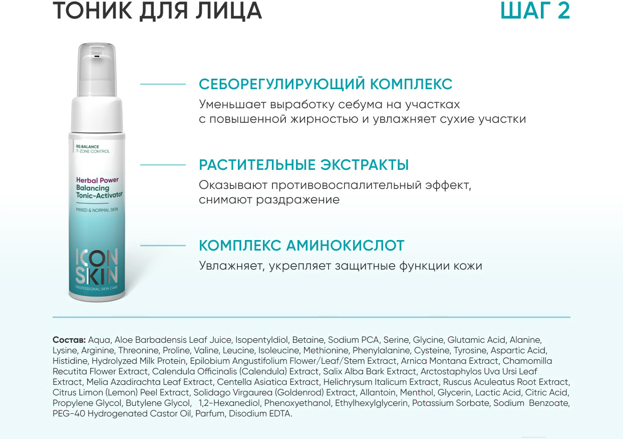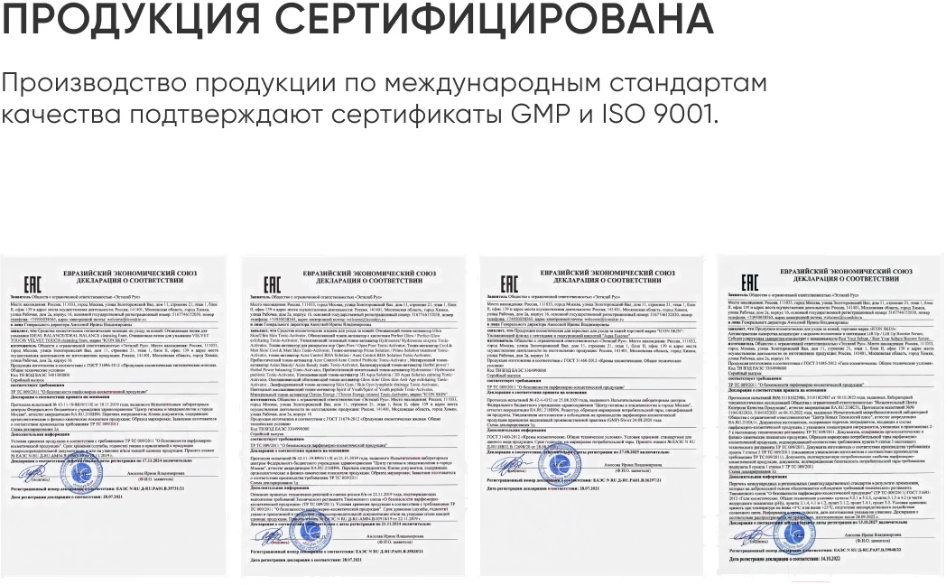 • Категория ухода увлажняющий, для сужения пор, успокаивающий, от черных точек, освежающий, восстанавливающий, выравнивание тона, себорегулирующий, укрепляющий, противовоспалительное, матирующее, антиоксидантный, придание упругости, защитный, придание эластичности, активация обменных процессов