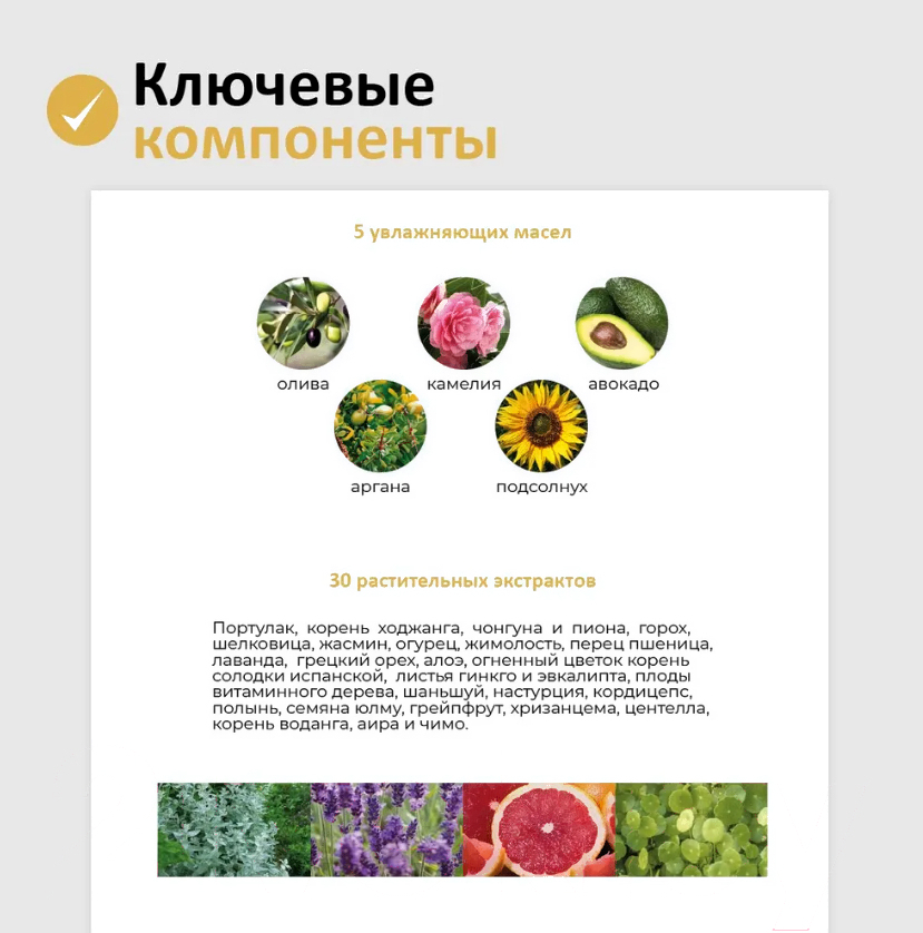 • Активные ингредиенты масло ши, масло арганы, масло оливы, аллантоин, масло подсолнечника, масло авокадо, экстракт лаванды, экстракт огурца