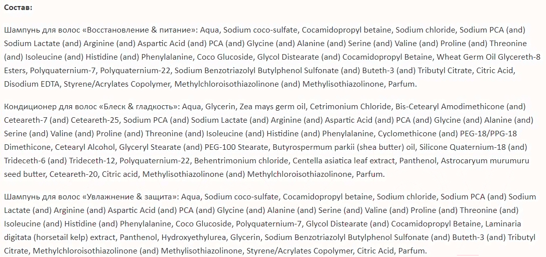 - Категория ухода очищающий, увлажняющий, питание, придание сияния, разглаживающее, против ломкости, тонизирующий, придание упругости, против секущихся кончиков, защитный, придание эластичности