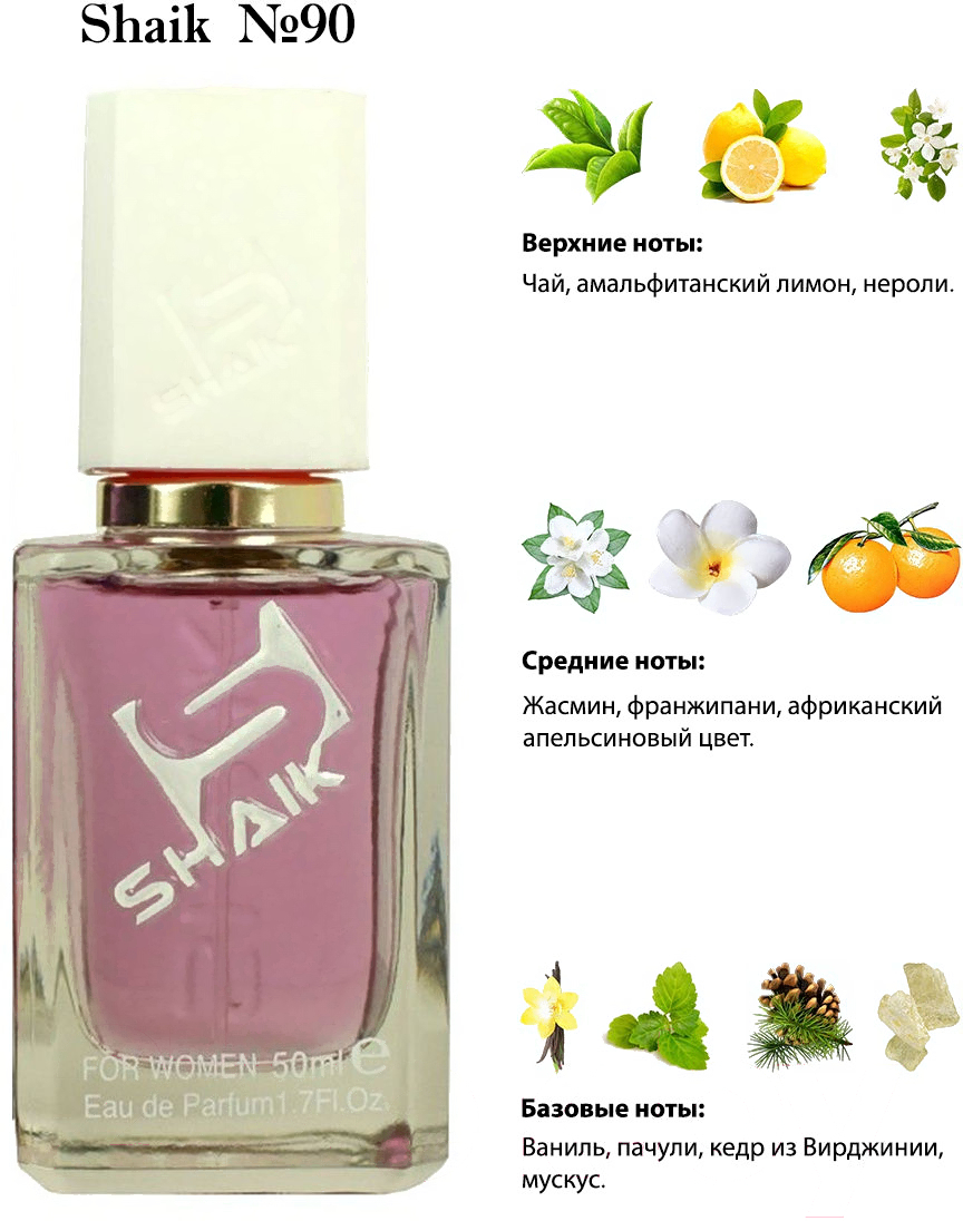 - Ноты ваниль, мускус, кедр (из Вирджинии), жасмин, лимон (амальфитанский), чай, пачули, нероли, апельсиновый цвет (африканский), франжипани