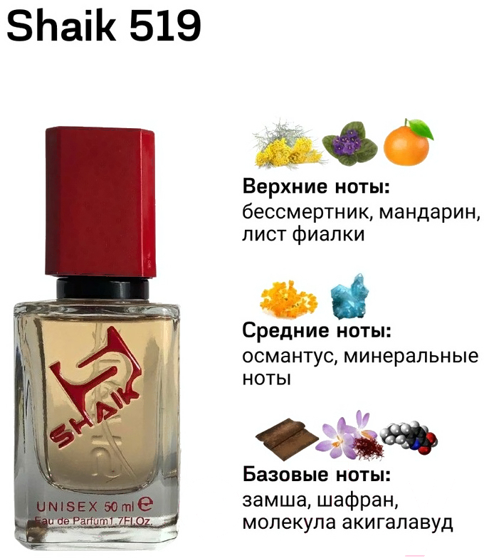 - Ноты мандарин, лист фиалки, акигалавуд, османтус, замша, шафран, бессмертник, минеральные