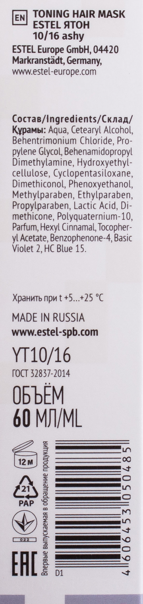 Тонирующая маска для волос Estel Я Тон 10/16 (60мл, пепельный )