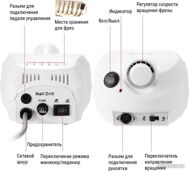 • Комплектация фрезы для маникюра, насадки, блок, педаль, пенал для фрез, ручка, подставка для ручки