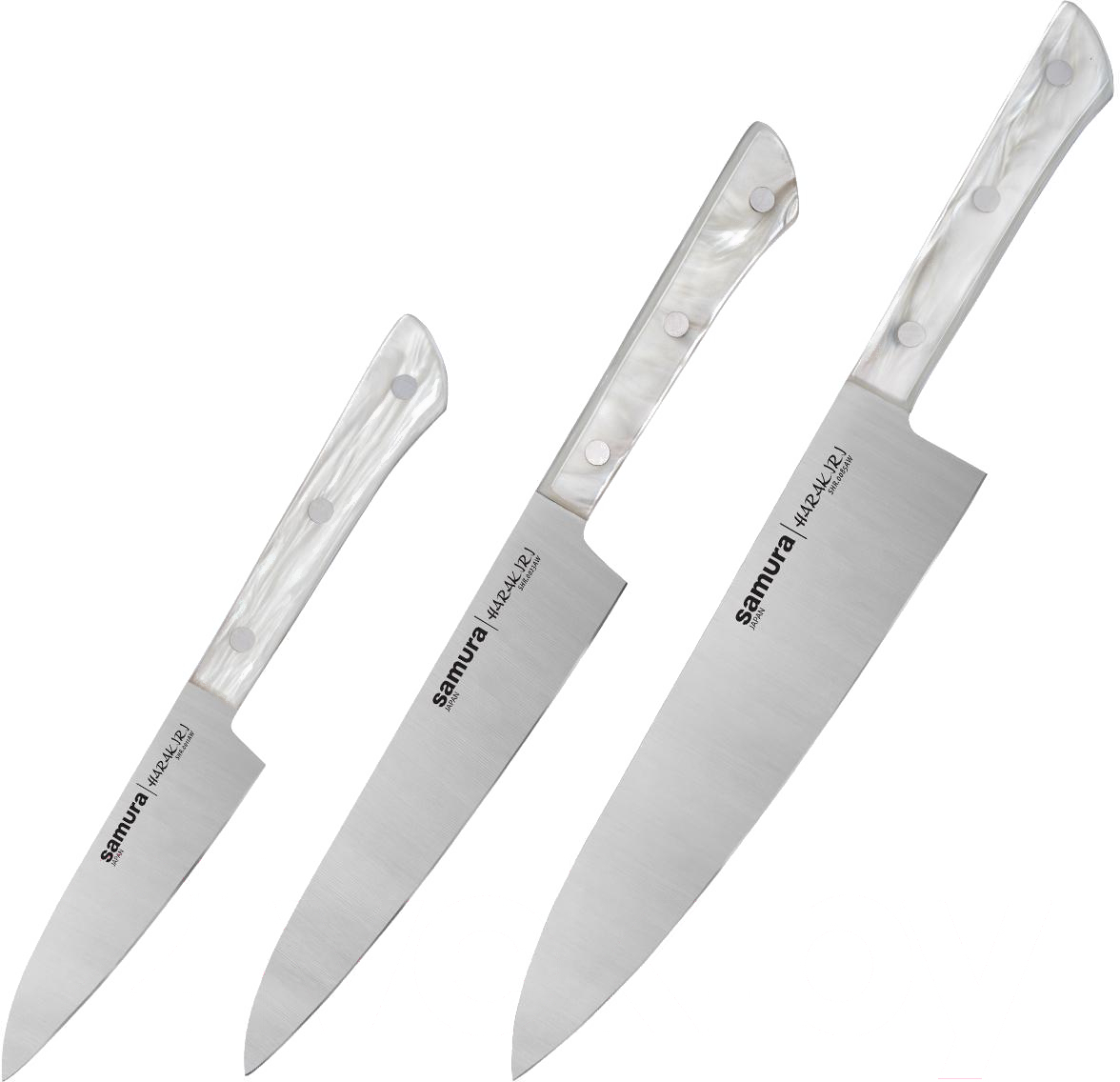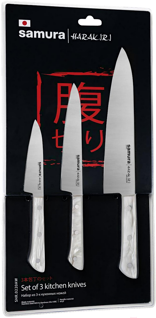 - Длина лезвия 20.8 см (шеф), 15 см (универсальный), 9.9 см (овощной)