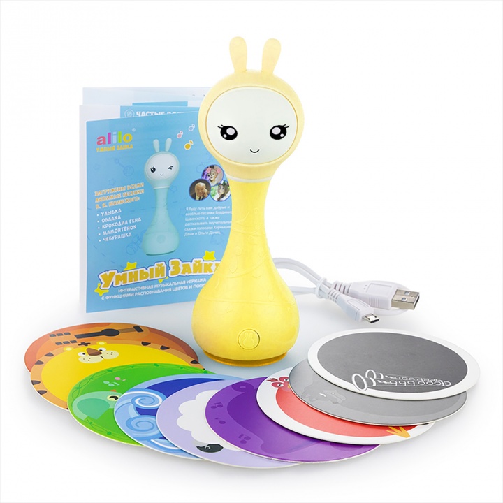 В наборе: 1 игрушка-зайка, 9 цветных карточек, Micro-USB провод.