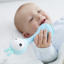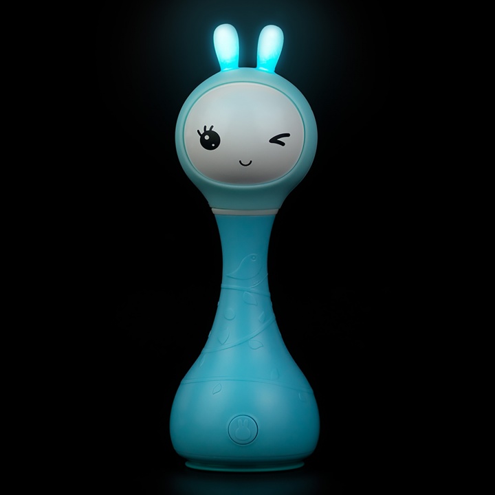 Игрушка имеет эргономичную форму и чем-то напоминает погремушку, которую малышу будет удобно держать маленькой ручкой. Зайка выполнен из высококачественного АБС-пластика, а ушки (которые светятся и переливаются 7 цветами) изготовлены из высококачественного силикона, поэтому их можно даже грызть.