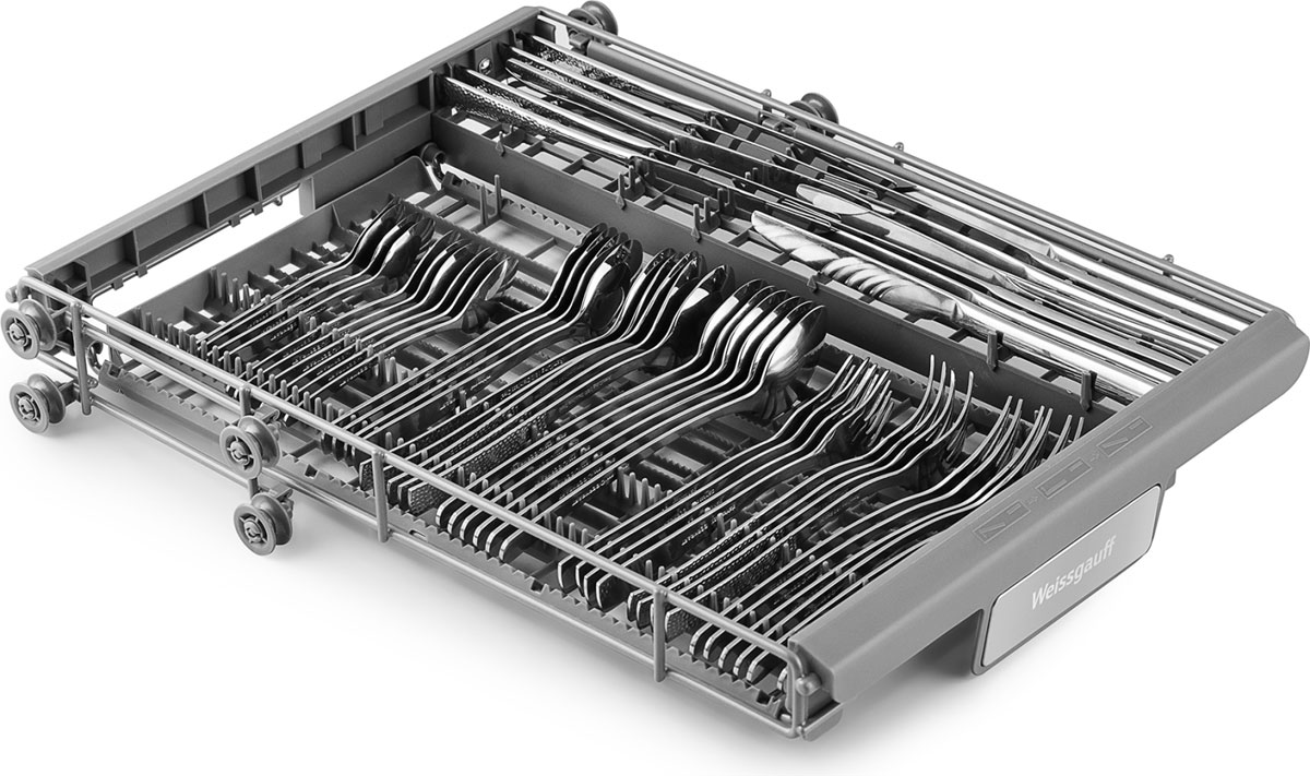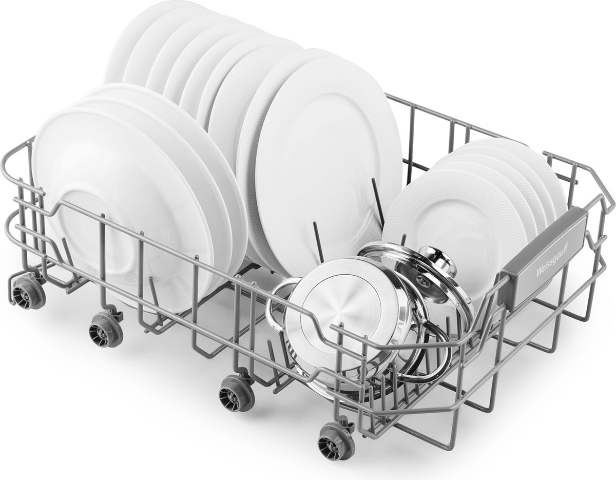 До 10 комплектов посуды одновременно вы можете расположить в данной посудомоечной машине, благодаря современным продуманным и эргономичный корзинам, которыми Weissgauff оснастили эту модель