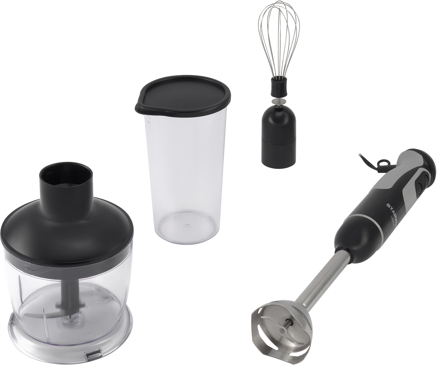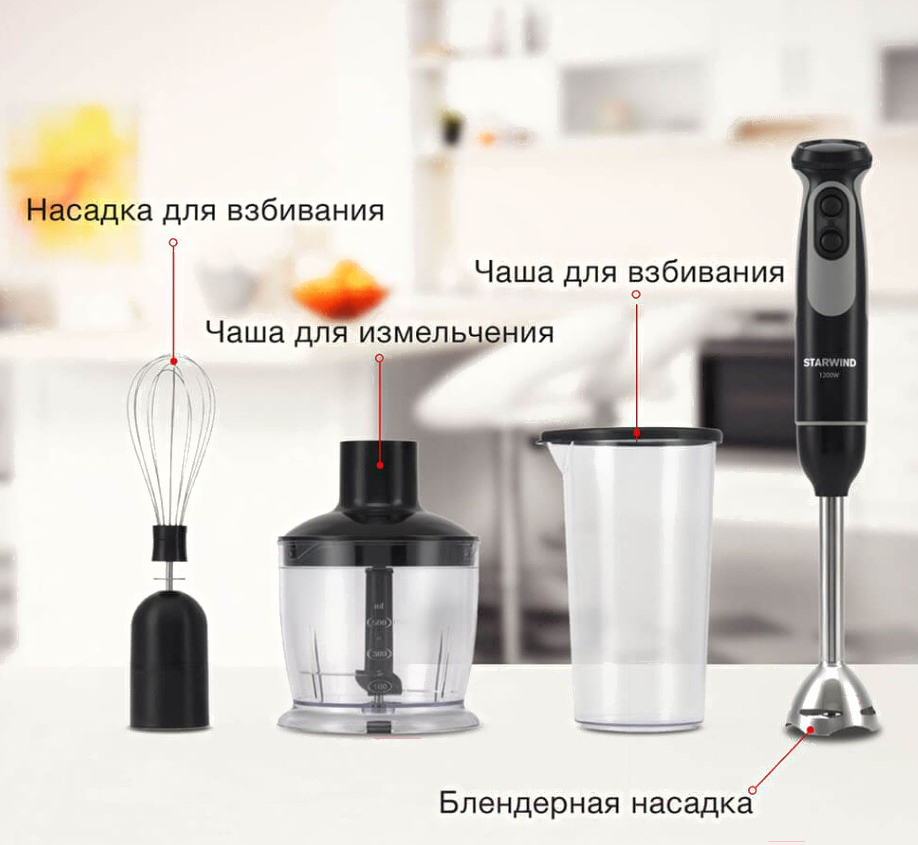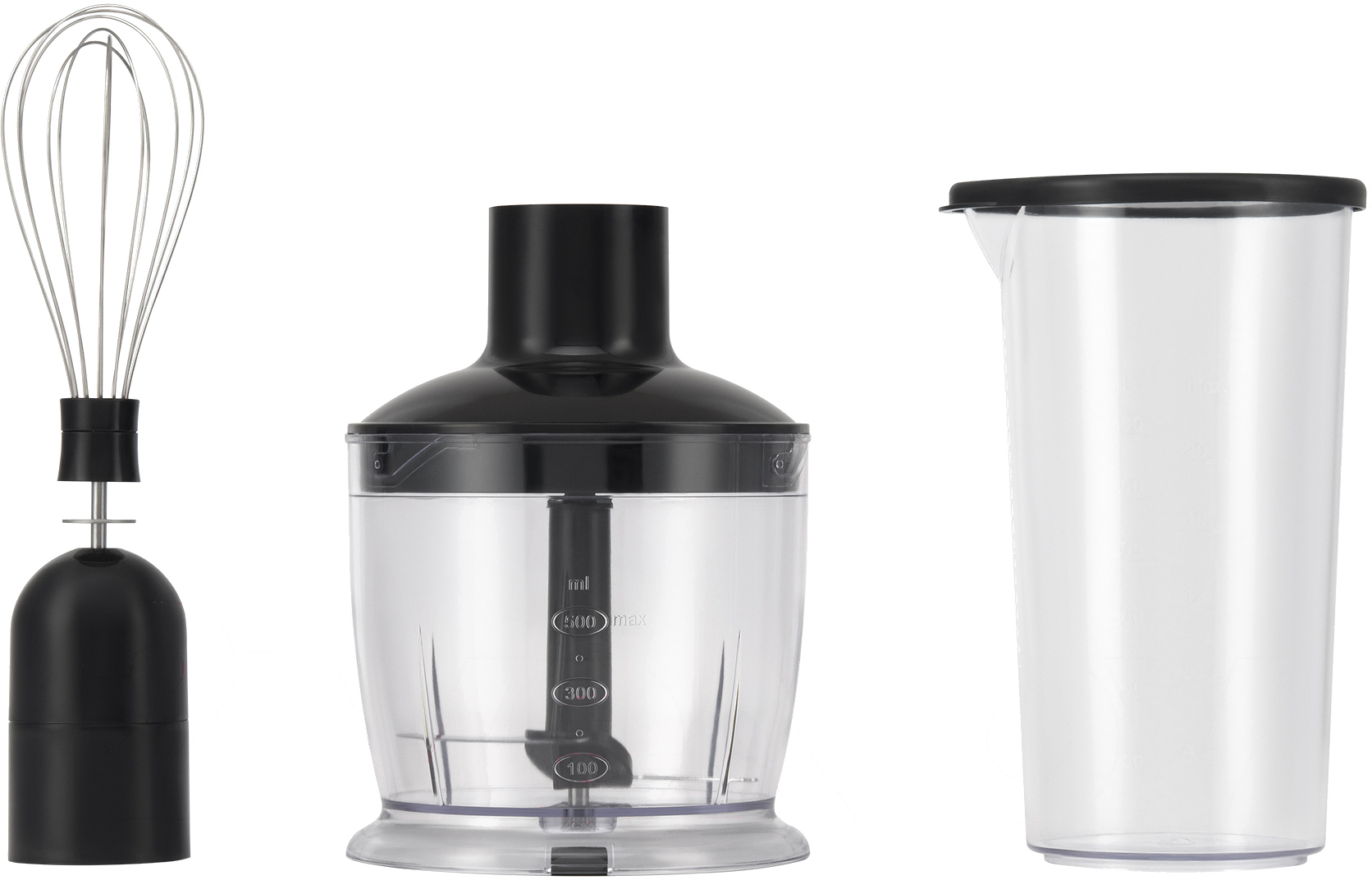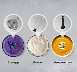 • В комплекте венчик, измельчитель, мерный стакан, крышка к стакану, чаша, насадка-блендер
