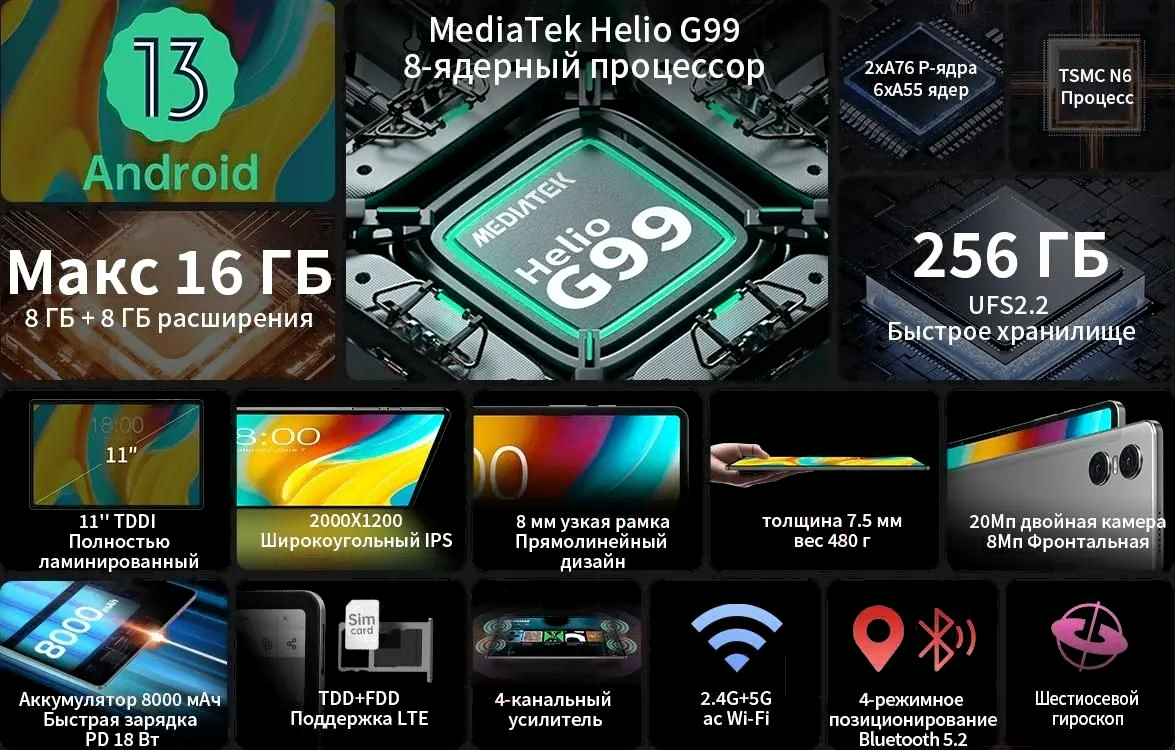 • Поддержка SIM-карты есть, 4G (LTE), 3G