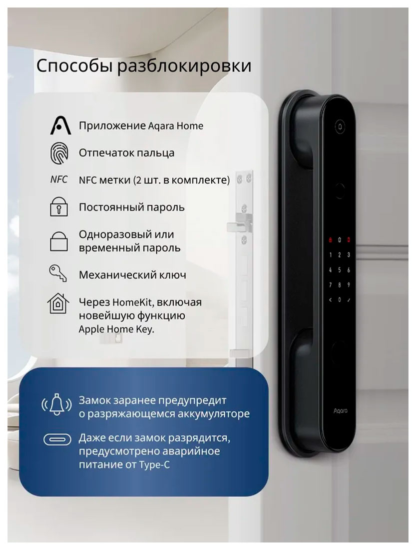 Литий-ионная аккумуляторная батарея обеспечивает около одного года автономной работы и оснащена портом USB-C для легкой зарядки. Даже если батарея разрядится, вы сможете открыть замок с помощью механического ключа или запитать его через порт Type-C.