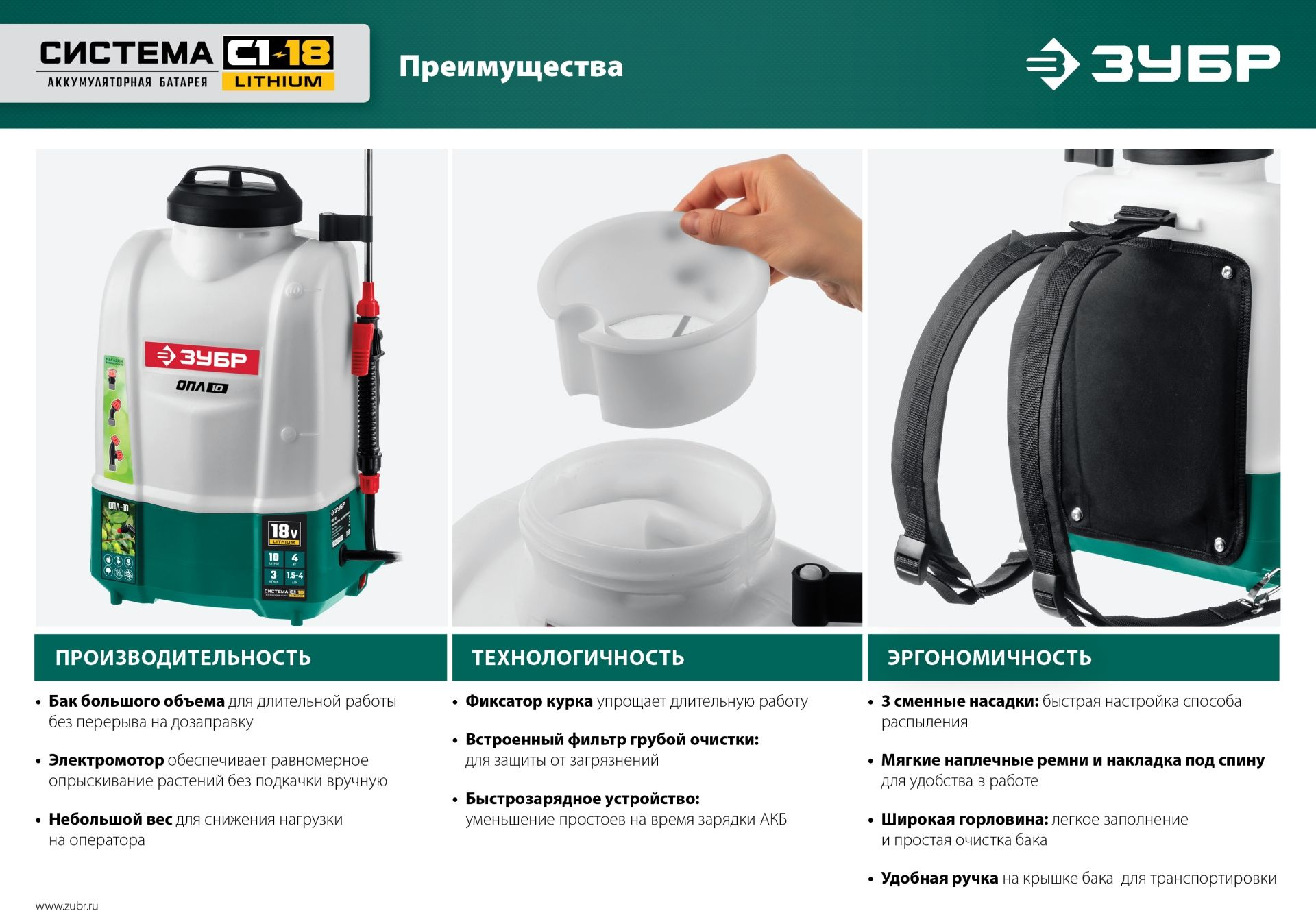 ОсобенностиЕдиная аккумуляторная система С1-18В для множества инструментов. Большой бак для смеси объемом 15 л обеспечивает длительную работу без дозаправки. Небольшой вес - для работы без усталости. Широкая горловина бака - легкое заполнение жидкостью. 3 сменные насадки.