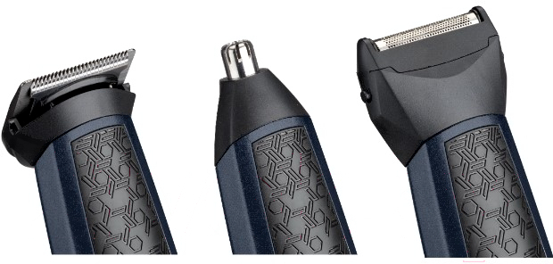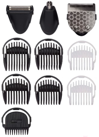 - Насадки насадка-бритва (сетчатая), триммер для носа и ушей (гигиенический), гребень для бороды (5 мм, 6 мм, 7 мм, 8 мм), гребень для тела (3 мм, 4 мм), гребень для щетины (1 мм, 3.5 мм)