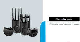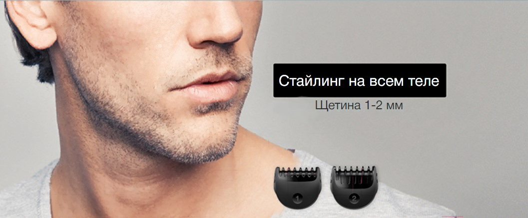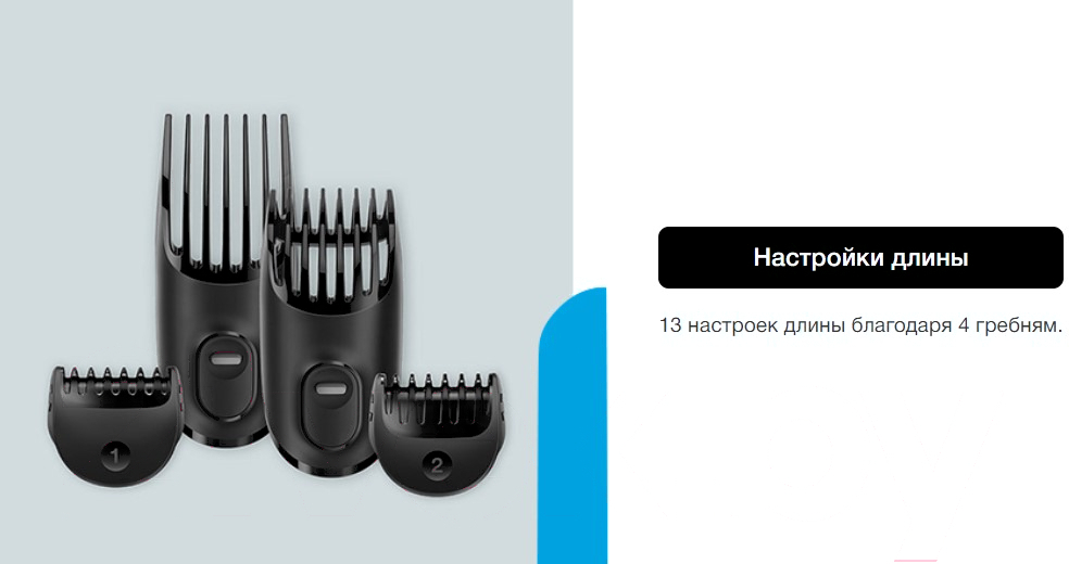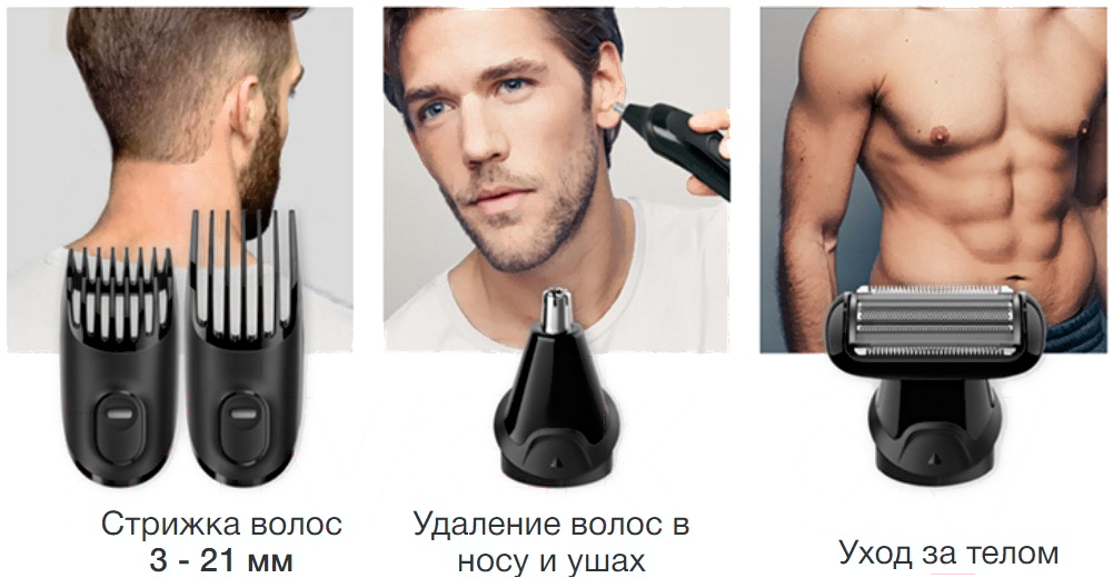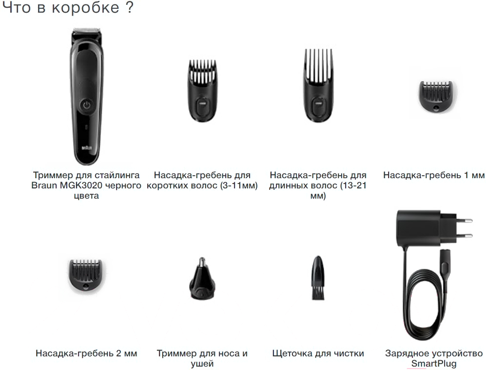 • Насадки триммер для носа и ушей, гребень для щетины (1 мм, 2 мм), для стрижки (3–11 мм, 13–21 мм)