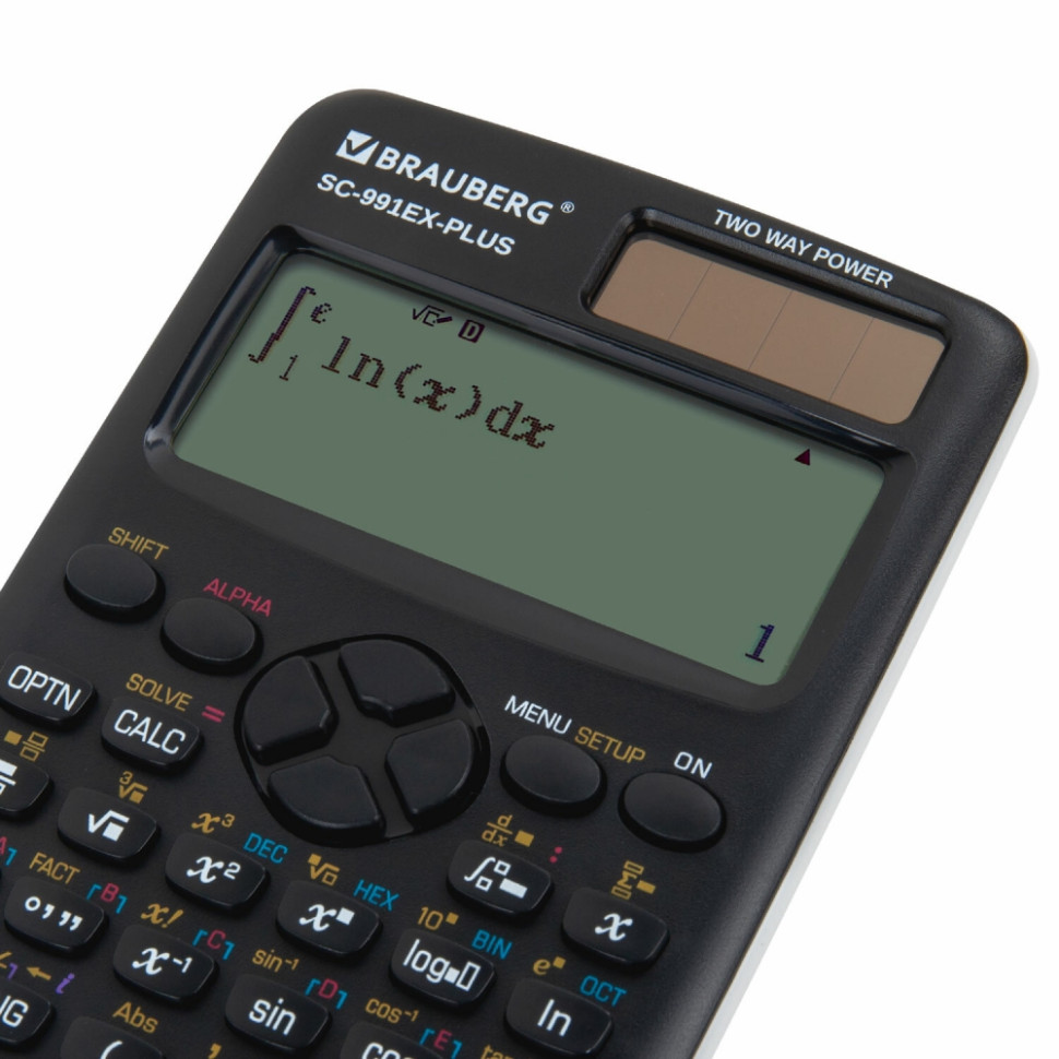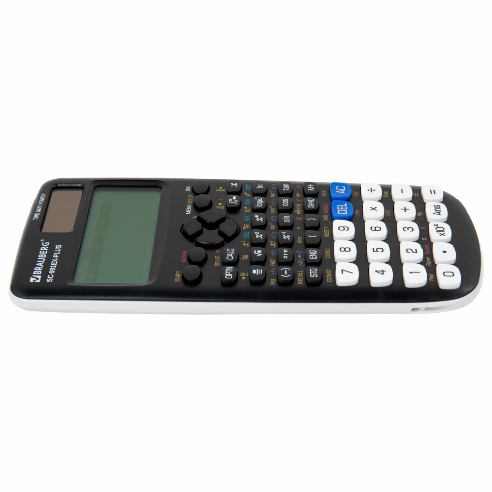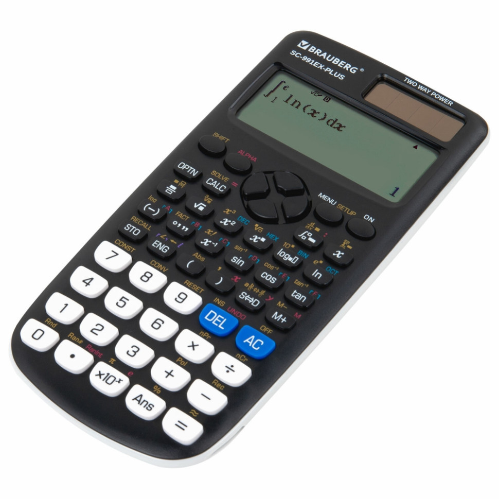 Непрограммируемый инженерный калькулятор BRAUBERG SC-991EX-Plus выполняет все основные вычисления, которые понадобятся школьникам на экзаменах и контрольных работах по физике, химии, биологии и географии. Сертифицирован для использования на ЕГЭ и ОГЭ. 552 встроенные научные и статистические функции позволяют вычислять степени и корни, факториалы, логарифмы и антилогарифмы, интегралы и дифференциалы, комплексные числа, а также производить статистические расчеты и вычисления с прямыми и обратными гиперболическими и тригонометрическими функциями (в том числе в градусах, радианах и градах), вычисления с векторами, матрицами, распределениями и таблицами и решать уравнения, неравенства, пропорции. Калькулятор поддерживает систему естественного ввода/вывода математических выражений и позволяет выводить на дисплей обыкновенные дроби, степени, корни, логарифмы и экспоненты в привычном всем еще со школы виде. Это делает интерфейс более "дружелюбным" для пользователя и позволяет снизить количество вычислительных ошибок. Калькулятор может переключаться между двоичной, восьмеричной и шестнадцатеричной системами исчисления. Наряду с кнопкой выключения OFF в калькулятор встроена функция автоматического отключения (через 8-10 минут бездействия), которая позволяет максимально продлить срок его службы без замены батареи. Материал кнопок – пластик. Размер – 165х84 мм. Гарантия – 10 лет. Разрядность дисплея: 12. Тип дисплея: жидкокристаллический. Количество функций: 552. Функционал: алгебраический ввод/вывод данных (S.V.P.A.M.), вычисление абсолютного значения, вычисления с комплексными числами, матрицами и векторами, генерирование случайных чисел, естественный ввод/вывод данных (N.V.P.A.M.), логические операции, построение таблиц значений функций, расчеты в нескольких системах исчисления, регрессионный анализ, редактор данных с последовательным просмотром, решение систем линейных уравнений, статистические расчеты одной переменной, суммирование, численное интегрирование и дифференцирование. Сертифицирован для ЕГЭ: да. Число строк дисплея: 2. Тип калькулятора: инженерный. Серия: SC-991EX-Plus. Конструктивные особенности: сдвижной пластиковый футляр. Тип питания: 1 батарейка L1154F/AG13, солнечный элемент. Цвет панели: черный. Длина корпуса: 165 мм. Ширина корпуса: 84 мм. Вес: 121 г. Упаковка: картонная коробка с европодвесом Бренд - BRAUBERG. Производитель - Китай. . Штрихкод - 4606224399140