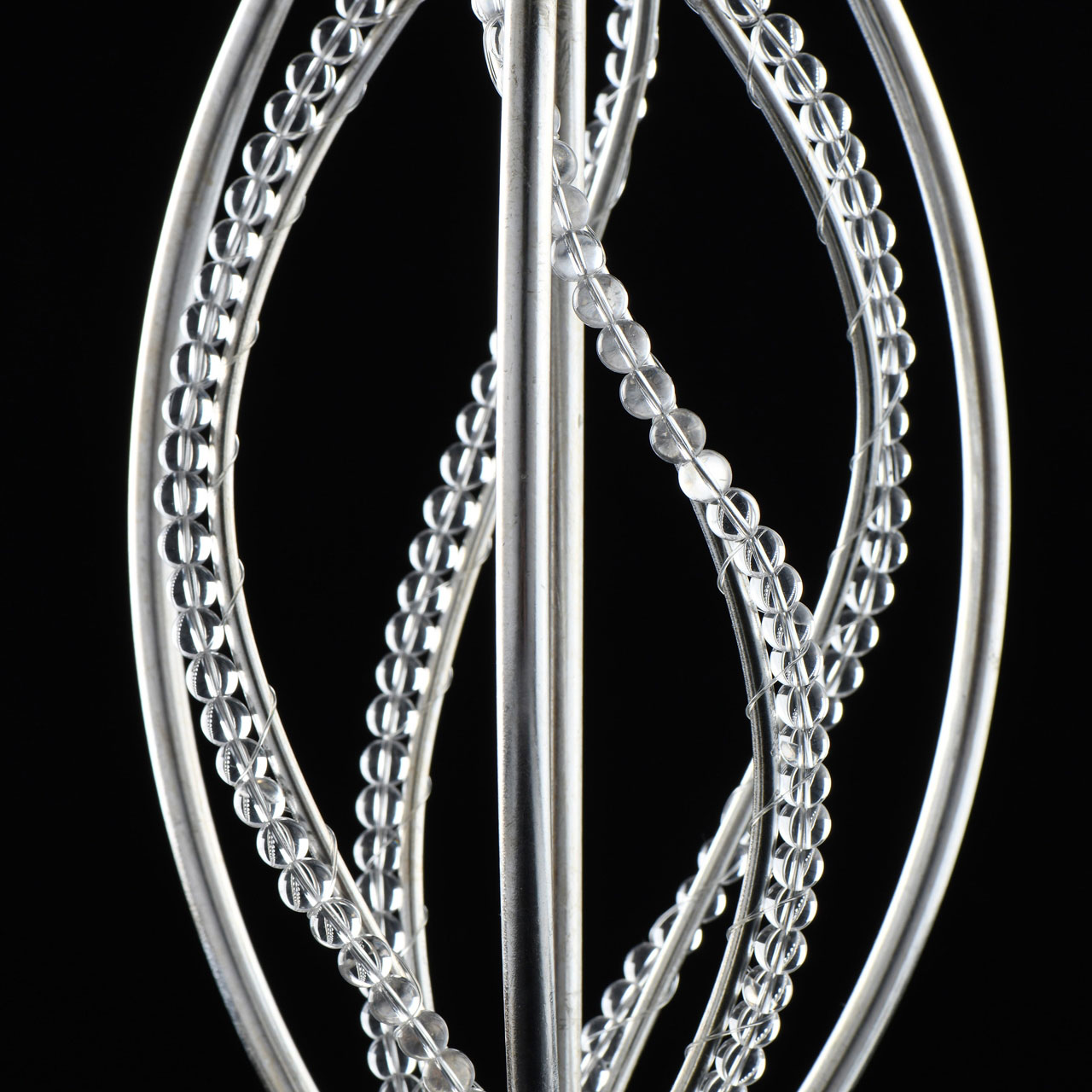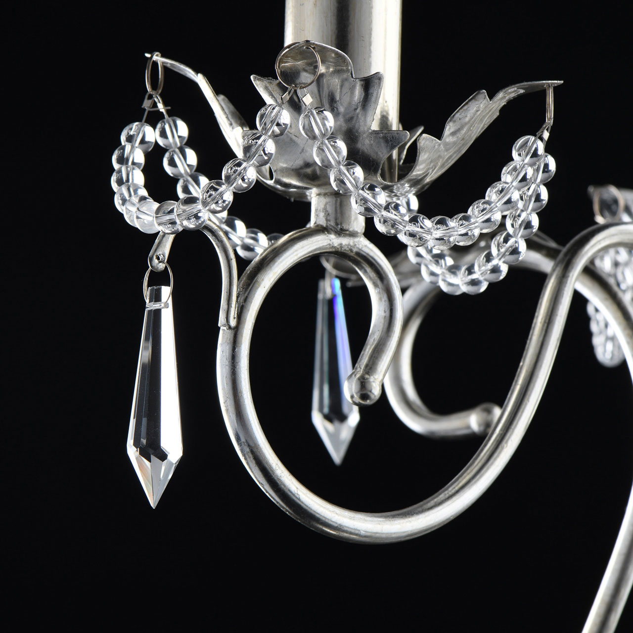 Декор из хрустальных подвесок прозрачного хрусталя и резных розеток придает легкости модели.Покрытие сусальным серебром ручной работы.Открытые источники света в виде классических рожков-свечей обеспечивают высокие параметры освещенности. Широкая семья из потолочных светильников на 18 и 10 ламп, настольного светильника и торшера.