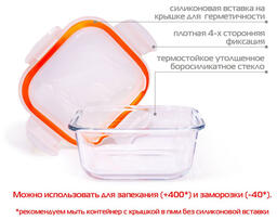 Для изготовления контейнера Auffman AM-3001 используется боросиликатное стекло, выдерживающее обширный диапазон температур от -40 до +400 градусов. Такой контейнер подойдет для разогрева еды в микроволновой печи и для заморозки продуктов в морозильной камере. Модель укомплектована пластиковой крышкой с уплотнительным кольцом и четырьмя защелками.
