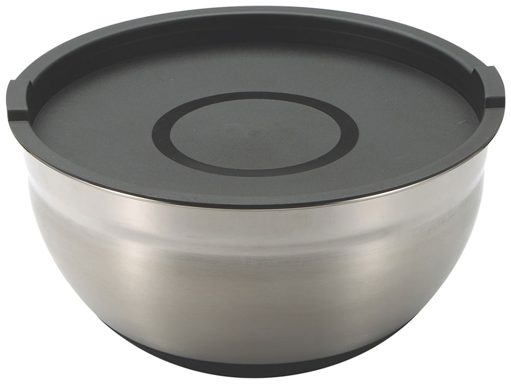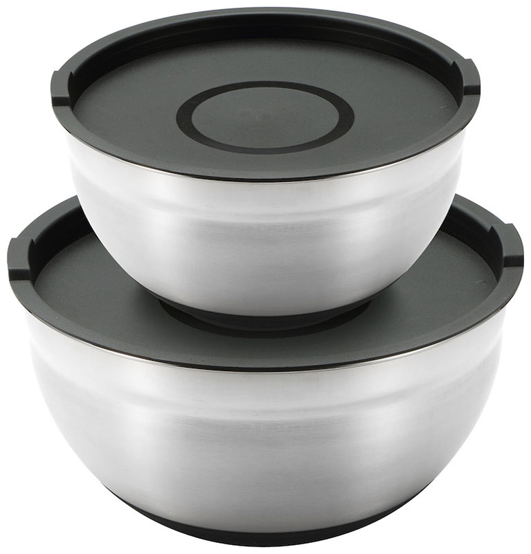 Набор мисок 4 предмета - нержавеющая сталь, миска с крышкой O20X11.5см 2.7л, миска с крышкой O24X12см 4,0л, внутренняя глянцевая отделка с измерительной шкалой, внешняя матовая отделка с выгравированным логотипом, с нескользящим силиконовым основанием черного цвета.