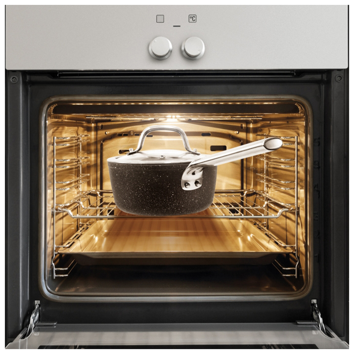 На антипригарной поверхности со свойствами неполированного натурального камня блюда не пригорают, готовятся быстро и равномерно.