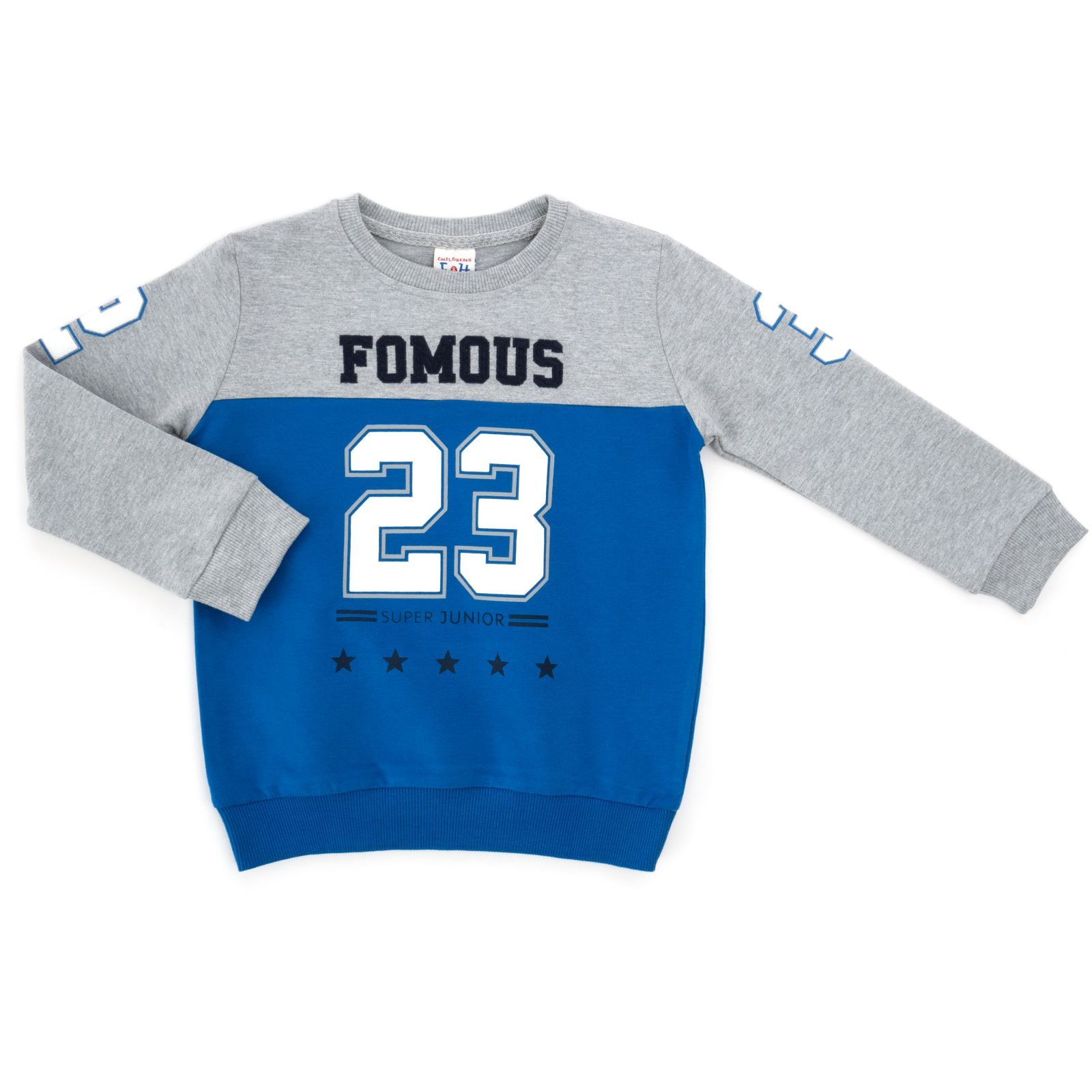 Світшот прямого покрою, з довгими вшивними рукавами, прикрашений спереду якісним контрастним принтовим малюнком та настроченою аплікацією з літер, і додатково по принтовій цифрі на кожному рукаві. Манжети на рукавах, лінія низу та