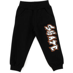 посилений широкою вставленою «гумкою». Штани прикрашені контрастним кольоровим принтовим написом.