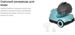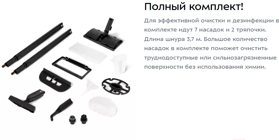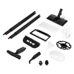 • Комплектация удлинительная трубка (2 шт.), мерный стакан, воронка, скребок, тряпка для пола, рамка для ковра, струйная насадка, насадка для отпаривания, тряпка для отпаривания, насадка для пола, держатель шнура питания, щетка (нейлоновая, стальная), уплотнительное кольцо (2 шт.)
