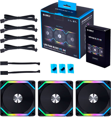 Вентиляторы LIAN LI UNI FAN SL V2 выполнены в корпусе черного цвета и украшены программируемой светодиодной подсветкой ARGB.