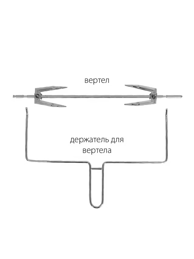 • В комплекте решетка, противень, вертел, держатель для вертела, ухват