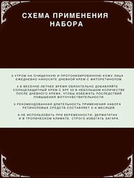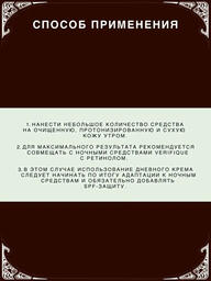 • Категория ухода увлажняющий, успокаивающий, восстанавливающий, питание, антивозрастной, выравнивание тона, придание сияния, укрепляющий, противовоспалительное, защита от солнца, разглаживающее, смягчающий, лифтинг, антиоксидантный, тонизирующий, заживляющее, придание упругости, выравнивание рельефа, придание эластичности, активация обменных процессов, регенерирующий, против пигментации