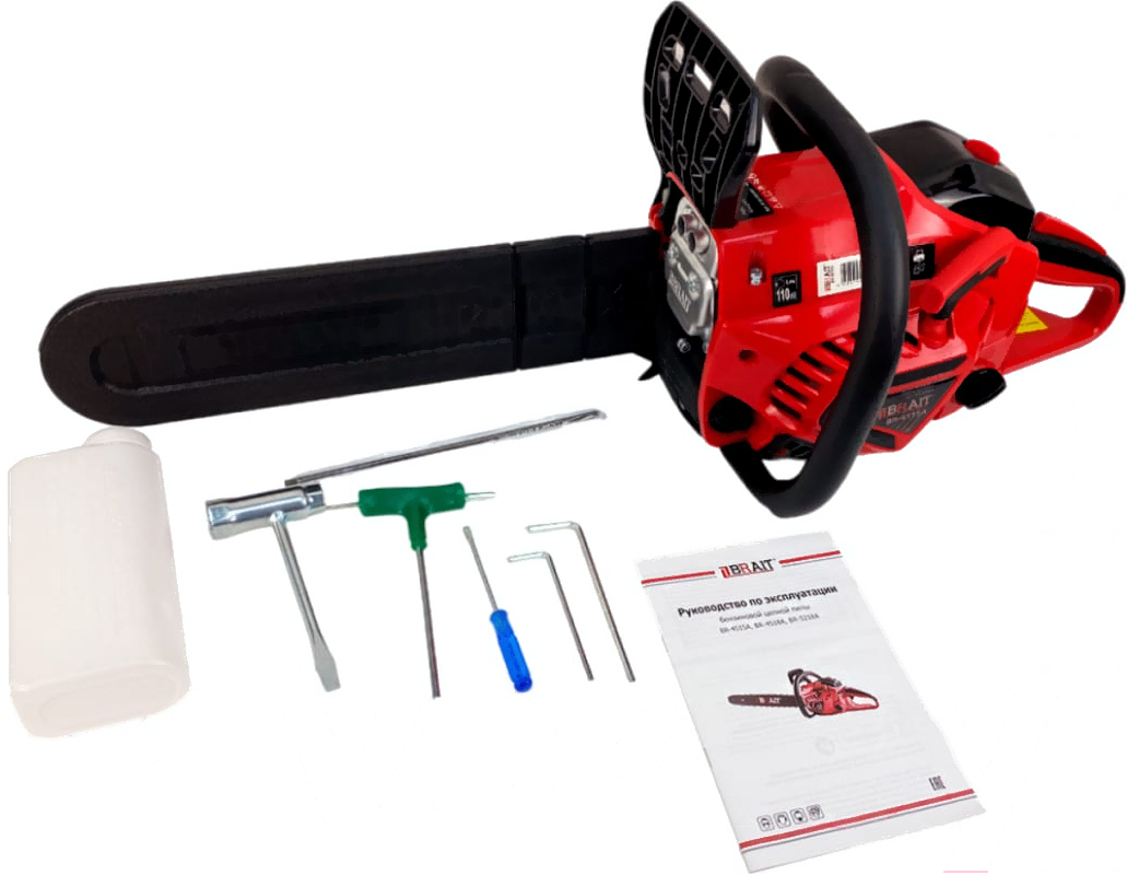 • В комплекте шина, цепь, емкость для топлива, набор инструмента, крепеж, инструкция, защитный кожух шины