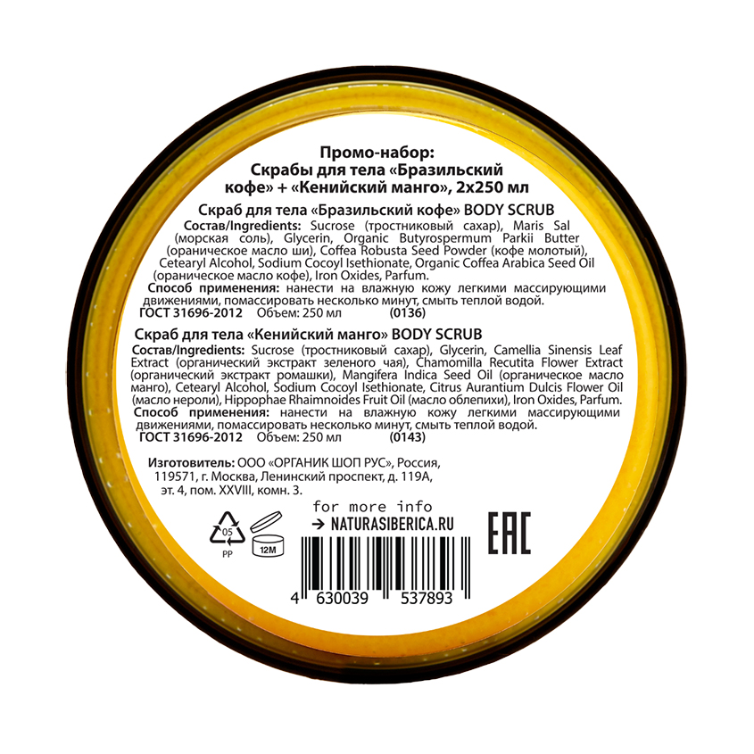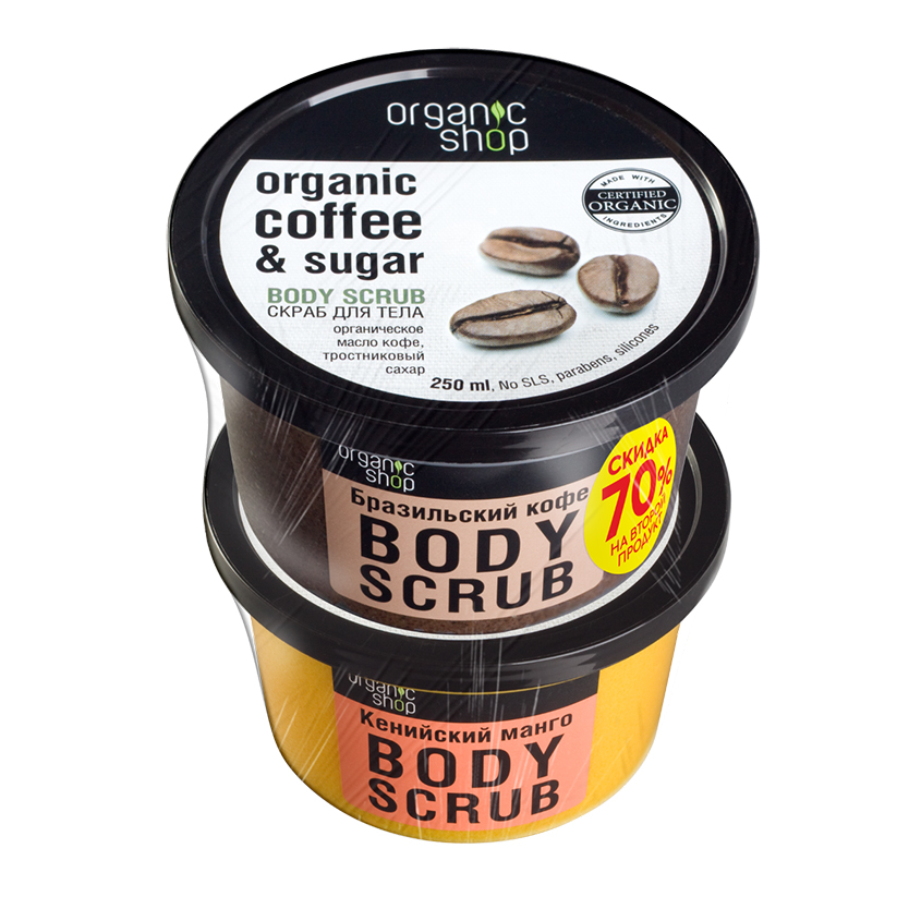 Organic Shop / Classic / Промо-набор: Скрабы для тела «Бразильский кофе» + «Кенийский манго», 2х250, Скрабы, которые дарят настоящее удовольствие и пользу при использовании! Натуральные экстракты, богатые полезными веществами масла, изысканные ароматы – все это содержат скрабы из классической серии Organic Shop.