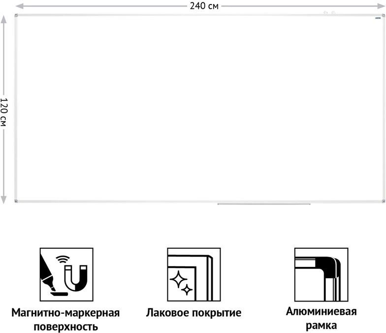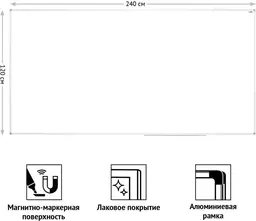 ОписаниеРазмер 120*240 Размещение настенное Вес нетто 12,5 Материал рамки алюминий Тип поверхности магнитно-маркерное Покрытие рабочей поверхности лаковое Материал рабочей поверхности металл Функция поворота нет Тип доски односторонняя Вид товара доска Тип крепления скрытое Наличие полочки есть Линовка нет
