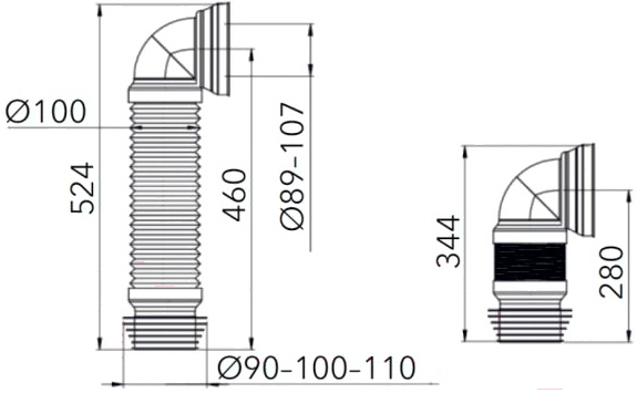 - Длина трубы/подводки от 0.344 до 0.524 м