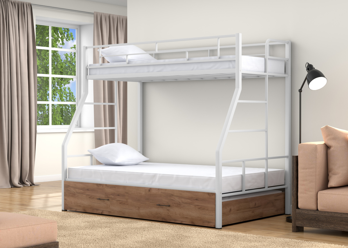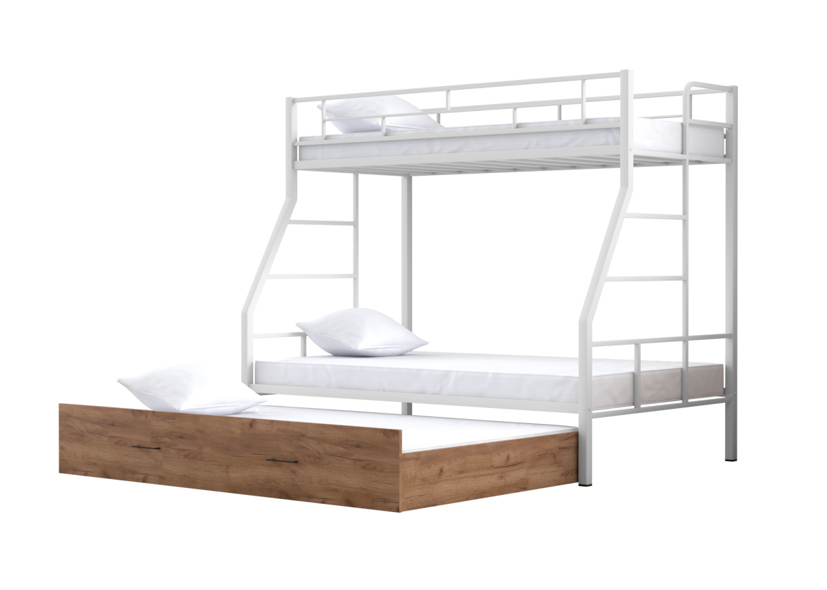 Двухъярусная кровать Раута Твист выкатная от Фабрики мебели 4 Сезона. Спальные места - 120х190 и 90х190. Выкатное спальное место из ЛДСП 16 мм 120х185 см, можно использовать как ящик для хранения.