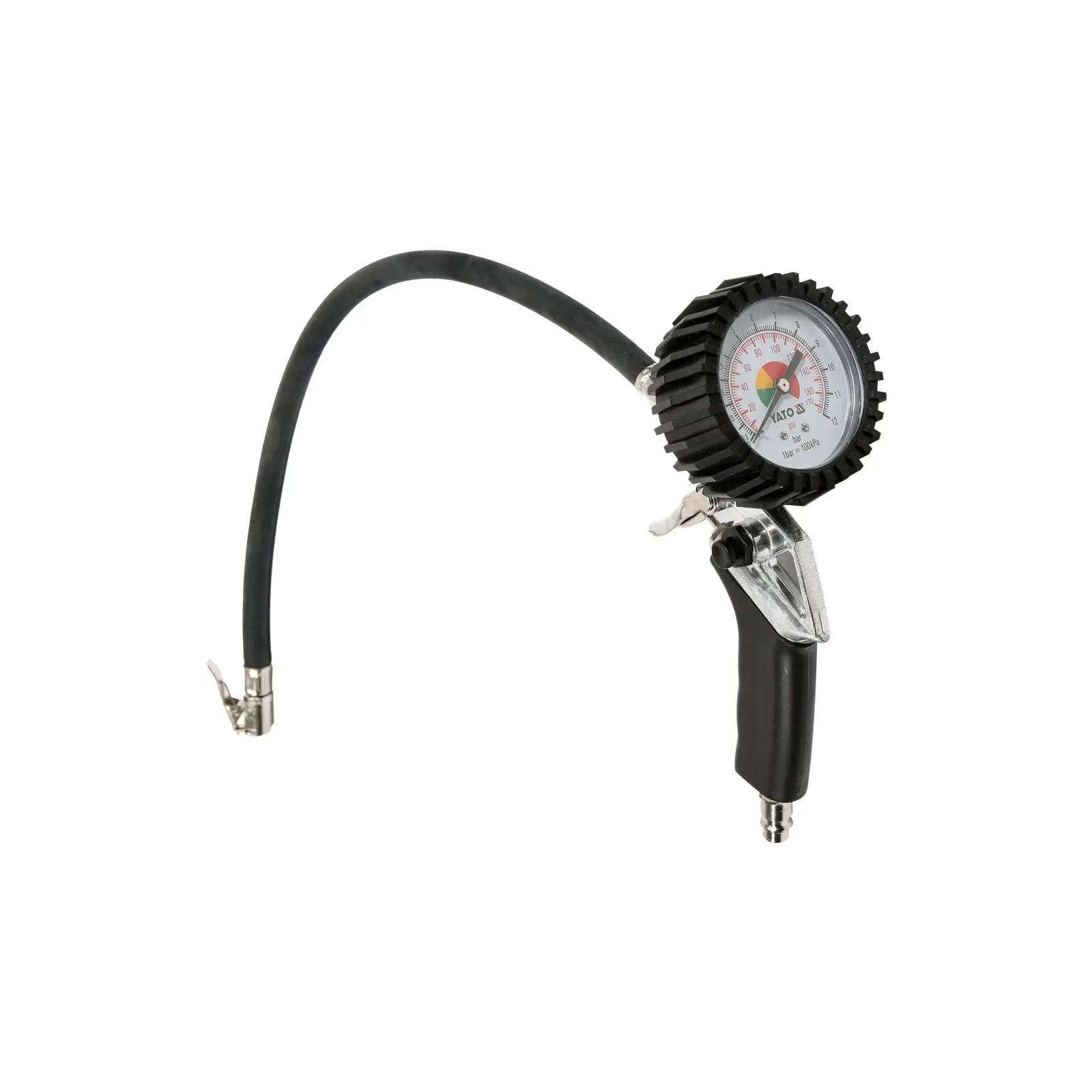 Пістолет для підкачки шин з манометром Yato YT-2370 необхідна річ для підкачки, контролю та стравлювання внутрішнього тиску в шинах автомобіля. Пістолет YT-2370 має вбудований манометр, за допомогою якого комфортно зчитувати показники тиску до 0,8МПа (8bar). При підключенні пістолета до зовнішнього джерела стисненого повітря, максимальний робочий тиск не повинен перевищувати 8кгс/см²(8bar). Манометра закріплений в гумовий корпус, для захисту від механічних пошкоджень. Корпус виконаний з алюмінію, високої якості, що забезпечить тривалий термін служби. Ергономічна ручка має компактну форму і покрита нековзним матеріалом. Гумовий шлаг, довжиною 40см, дозволяє приєднати пістолет до ніпеля в будь-якому положенні колеса. За рахунок швидкоз'ємного з'єднувача, розмір вхідного отвору 1/4"дюйма, можна швидко і легко приєднається до джерела подачі стисненого повітря. Даний пістолет, знайшов широке застосування не тільки автомайстерень, шиномонтажі але і на високоточному виробництві.