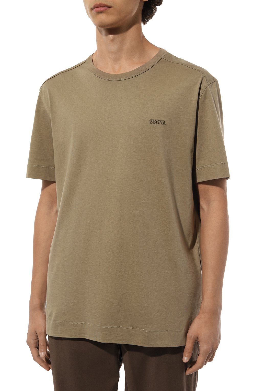Лаконичная футболка оттенка хаки подружится и с брюками, и с потертыми джинсами. Модель получилась особенно мягкой за счет хлопкового дышащего трикотажа, обработанного в технике мерсеризации для прочности и придания элегантного блеска. Изделие украсили логотипом, который поддержали миниатюрной нашивкой сзади, символизирующей дорогу 232, проходящую через заповедник Oasi Zegna.