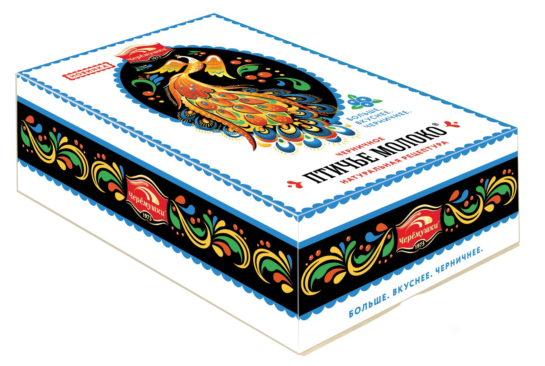Особенностью торта является нежное черничное суфле на агар-агаре, приготовленное с использованием натуральной черники. В основе торта тонкие сдобно-сбивные коржи, сверху покрыт тонким слоем кондитерской глазури.